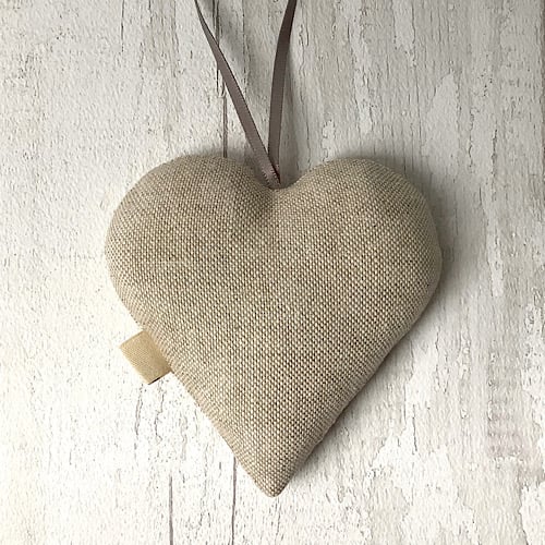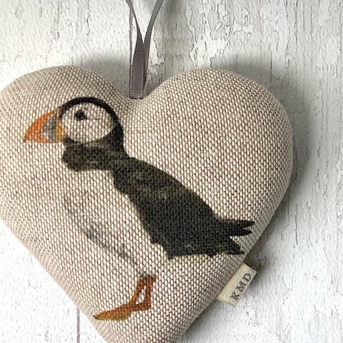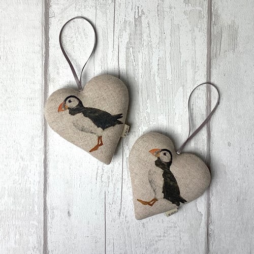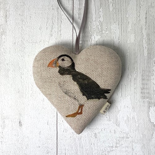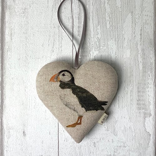 Hanging heart in natural linen with a pretty puffin print. 9cm wide by 16cm high to top of ribbon. Stuffed. This little heart makes the perfect mini gift or thank you. For Mum, teacher, friends or just the one you love!