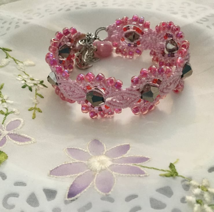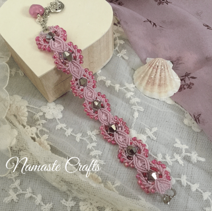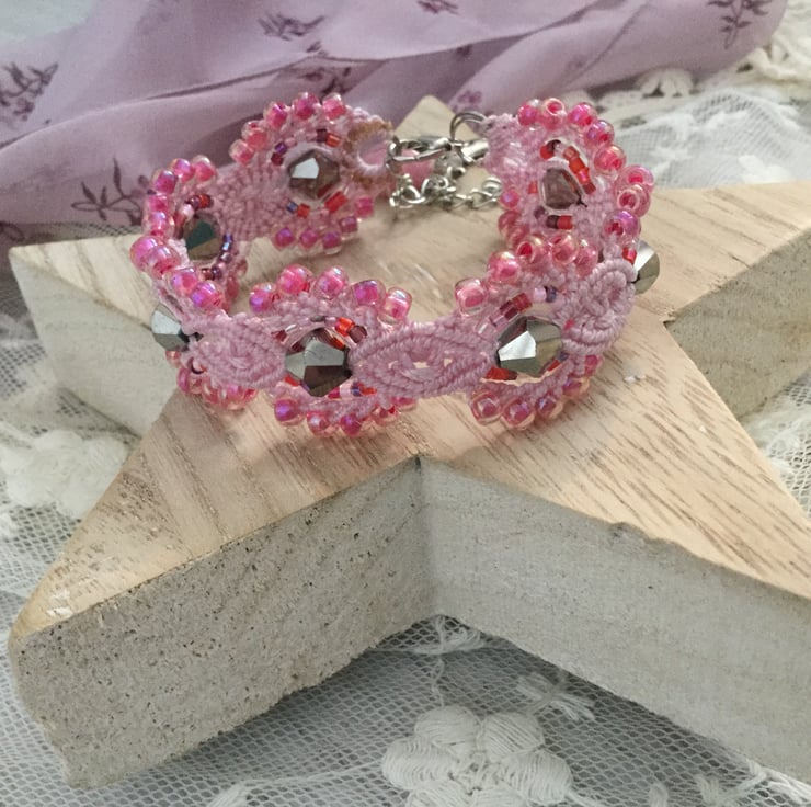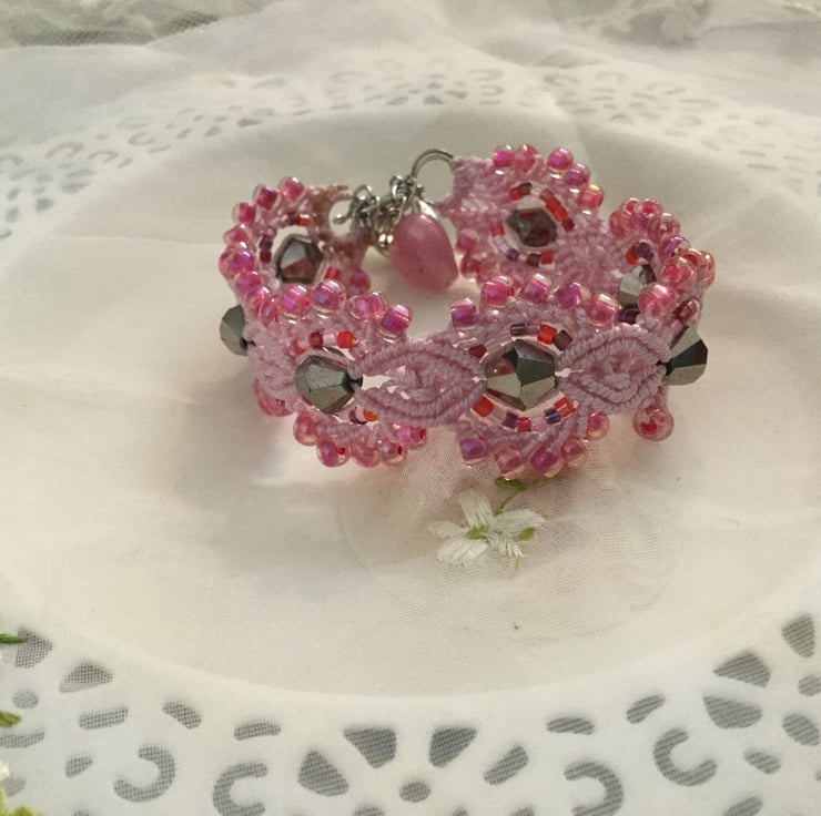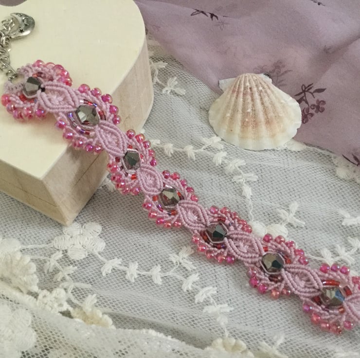 Created by myself using the intricate knotting technique of macrame. I have used a lovely soft pink C Lon 0.5 mm macrame cord and interlaced with Czech fire polished beads, and Japanese seed beads for a bit of sparkle.