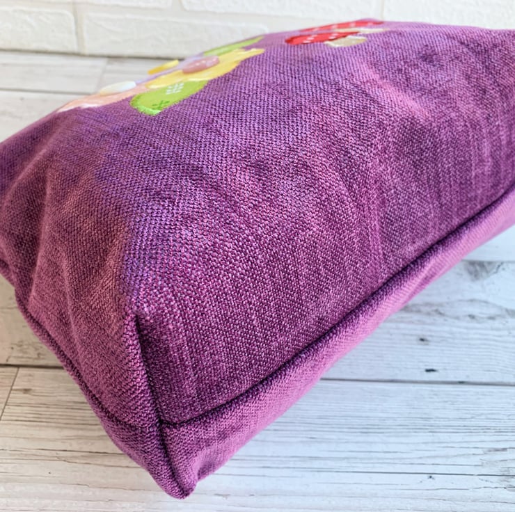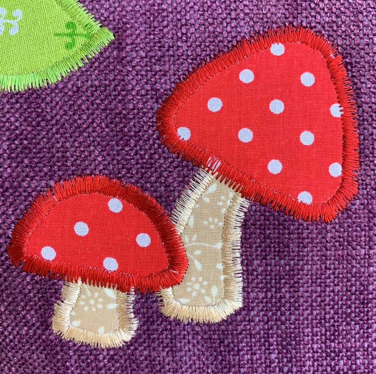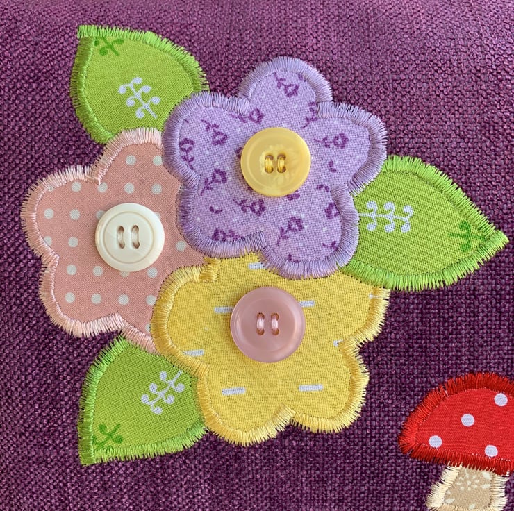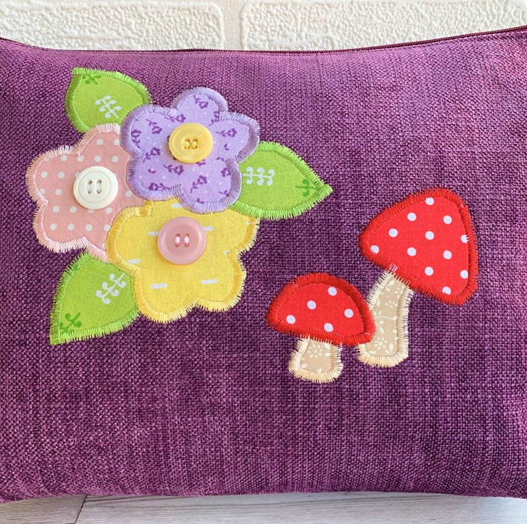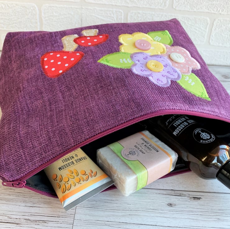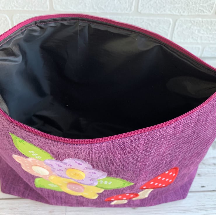 A spacious toiletry bag in lovely purple textured fabric with appliqué mushrooms and flowers. The toadstools have red and white polka dot caps and stems of beige fabric with a ditsy white leafy pattern. The flowers are pastel prints, one in lilac with ditsy purple flowers, one in pale pink with white polka dots, and one in yellow with white dashes. The flowers have zesty green leaves with a white pattern. I've added a button to the centre of each flower. The bag fastens with a purple zip and is lined with black water-resistant fabric. The base of the bag is boxed to give lots of space for all those essential items.