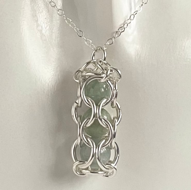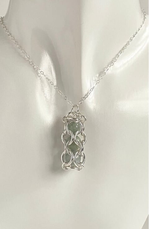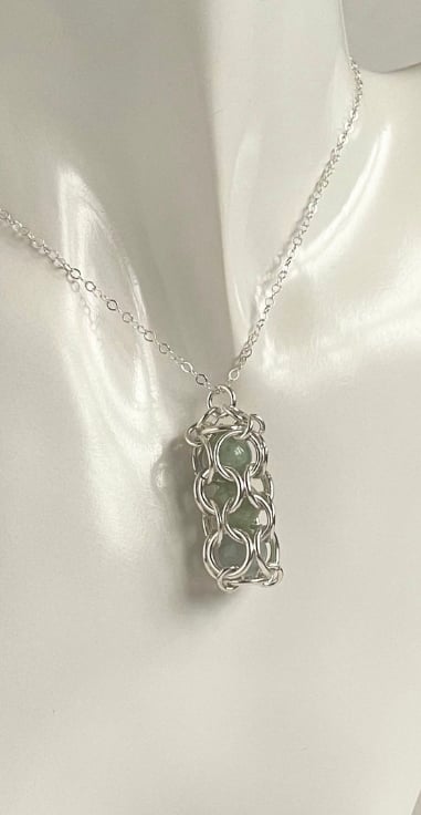 Individual Sterling Silver rings have been interlinked to form a chainmaille cage to encase three Jadeite gemstones. Creating a tubular design.