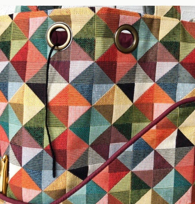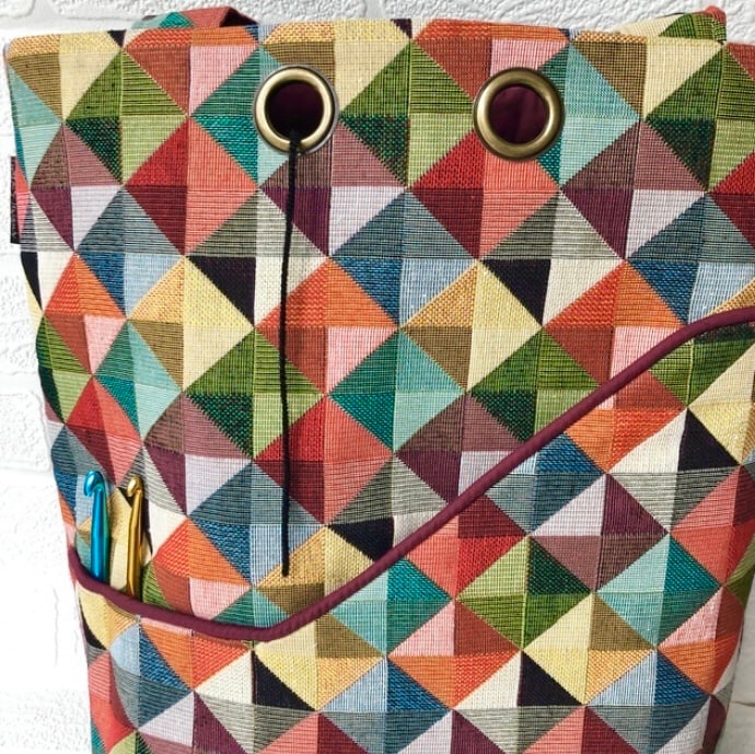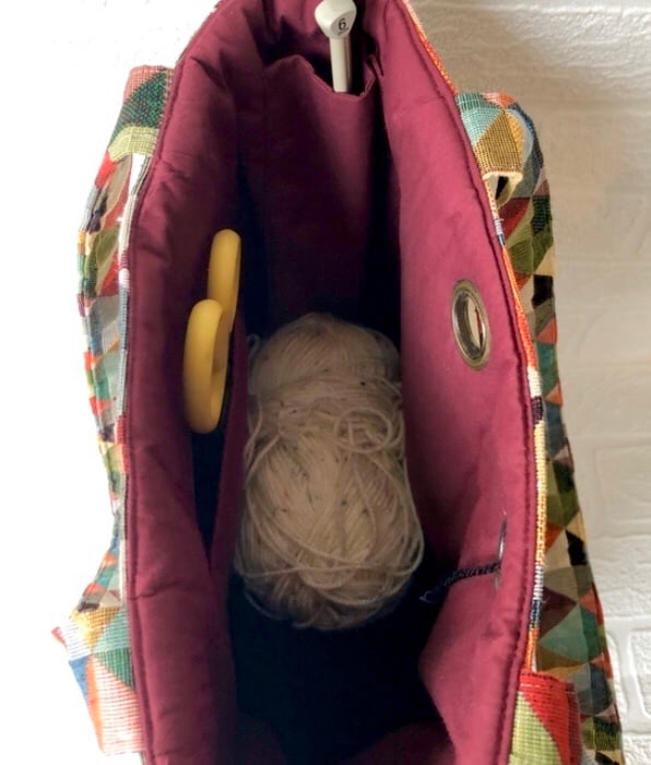 This sturdy knitting bag is made from a colourful tapestry fabric and lined with a burgundy coloured polyester cotton.