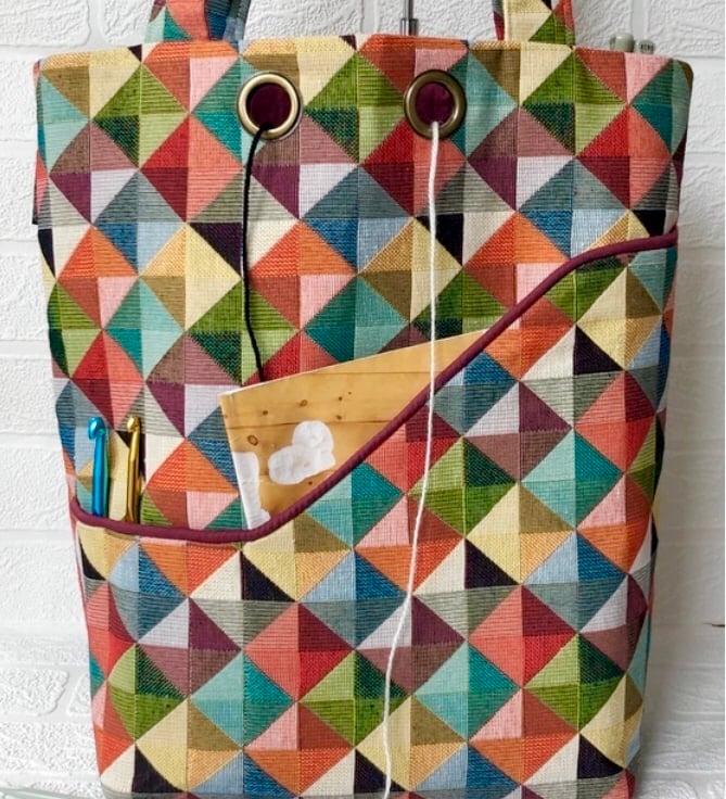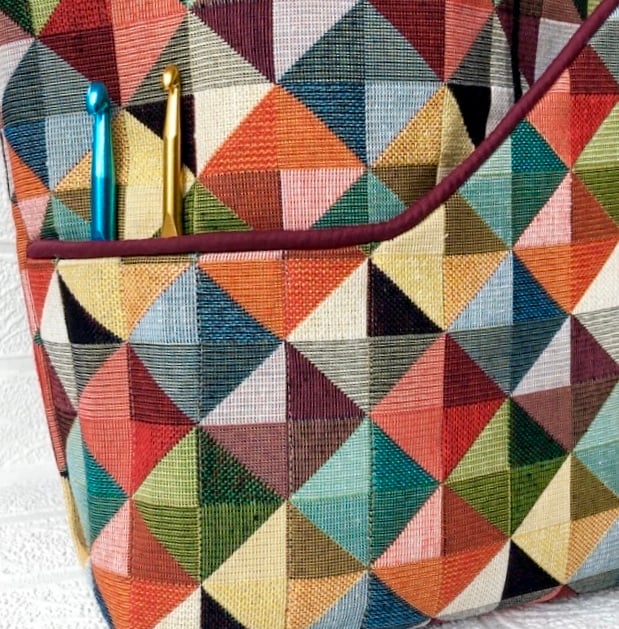 The unusual shaped pocket on the front will hold your patterns and I have machined small pockets for you to store your crochet needles.