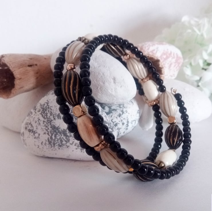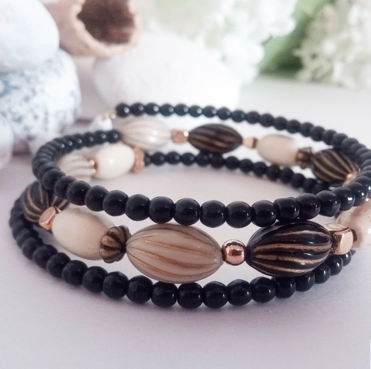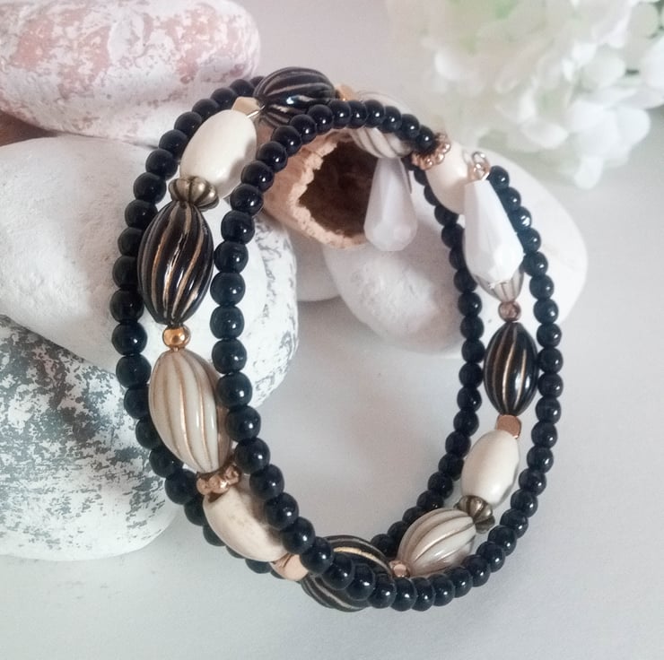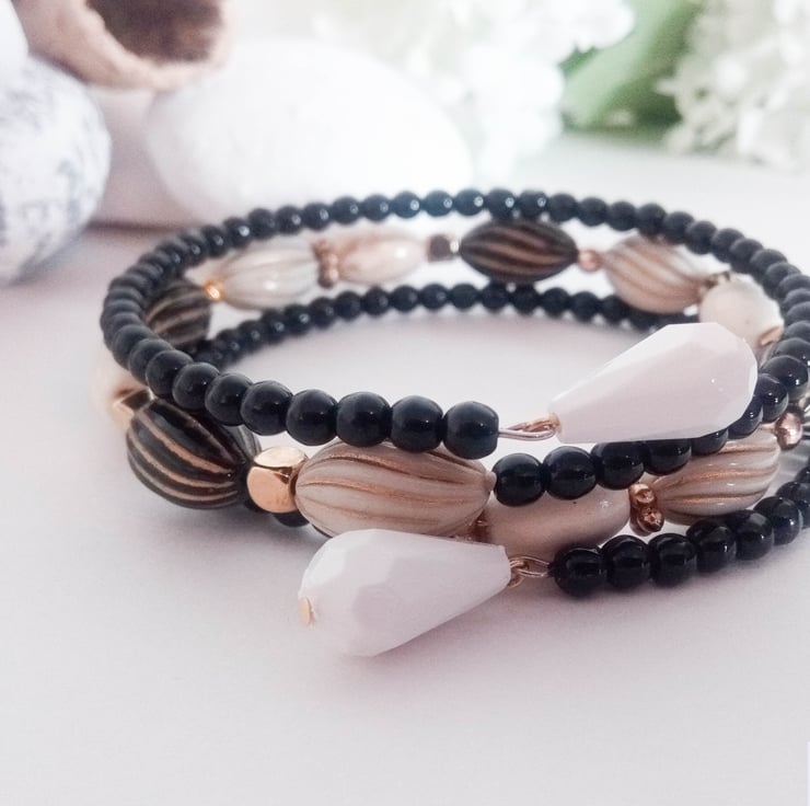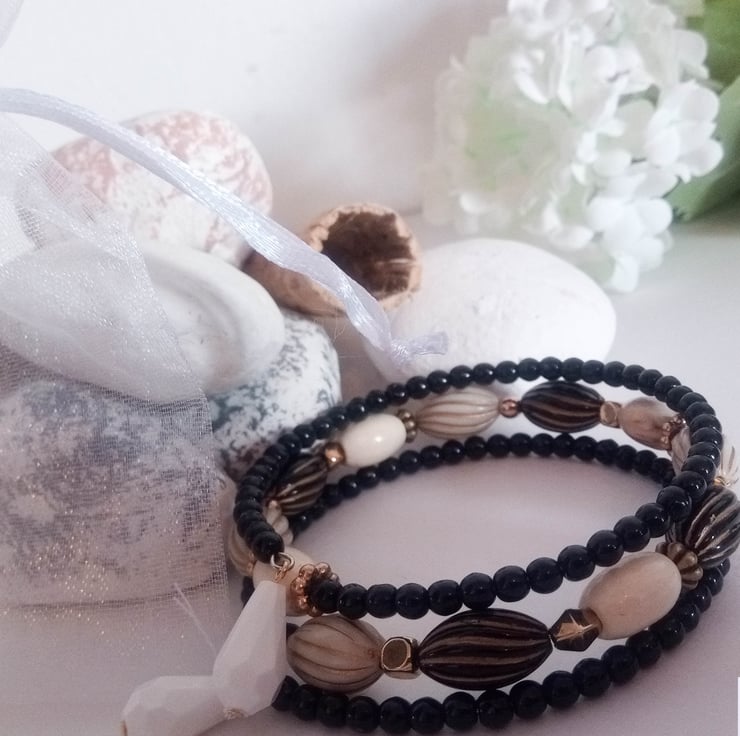 This is a three loop beaded bracelet which is made from memory wire which allows easy adjustment to put on and take off the bracelet. The outer two loops of the bracelet are made with black beads and the middle loop features black, gold, and cream beads, giving it an elegant look. The bracelet is finished off with two white faceted and gold finding drop bead charms.