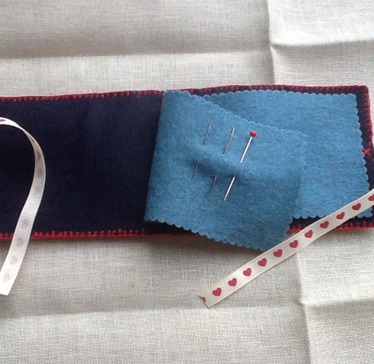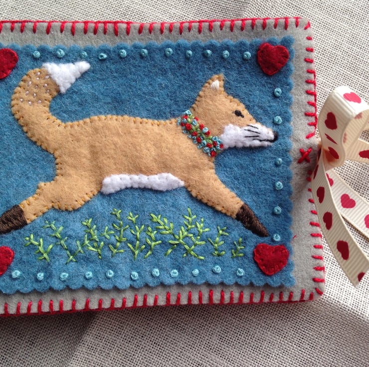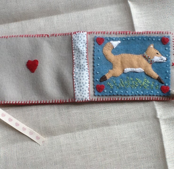 I have designed and hand sewn this needle case. It features an appliquéd fox jumping over embroidered greenery, French knots and small hearts for a folk art feel. It has 2 felt pages for holding needles and pins, a cotton spine and ribbons to tie it closed. It measures 12 cm by 9 cm when closed and 24 cm by 9 cm when open. The front and inner covers are blanket stitched together.