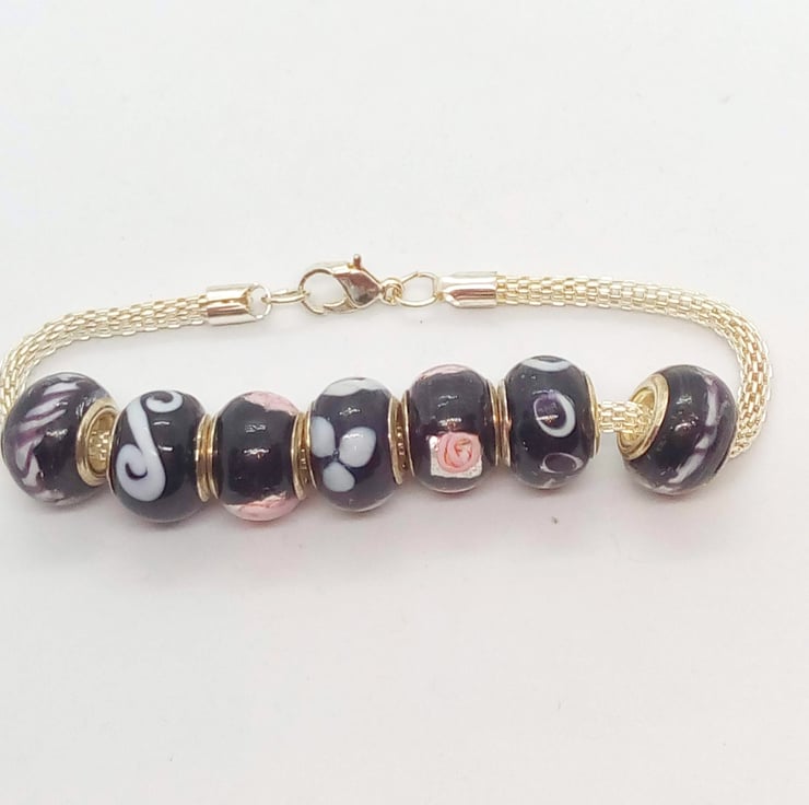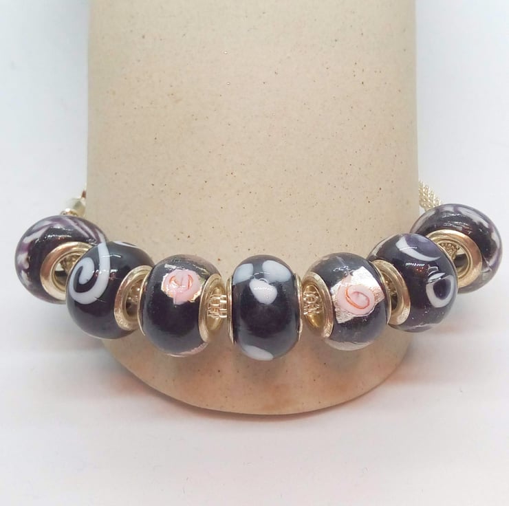 This very attractive jewellery set is made using 12 mm x 10 mm shades of black glass lampwork beads with silver plated charms. The charms include a 20 x 20 mm silver plated heart and 25 mm silver plated key on the necklace. The necklace is on a black rubber necklace and the bracelet is on a silver plated mesh chain.