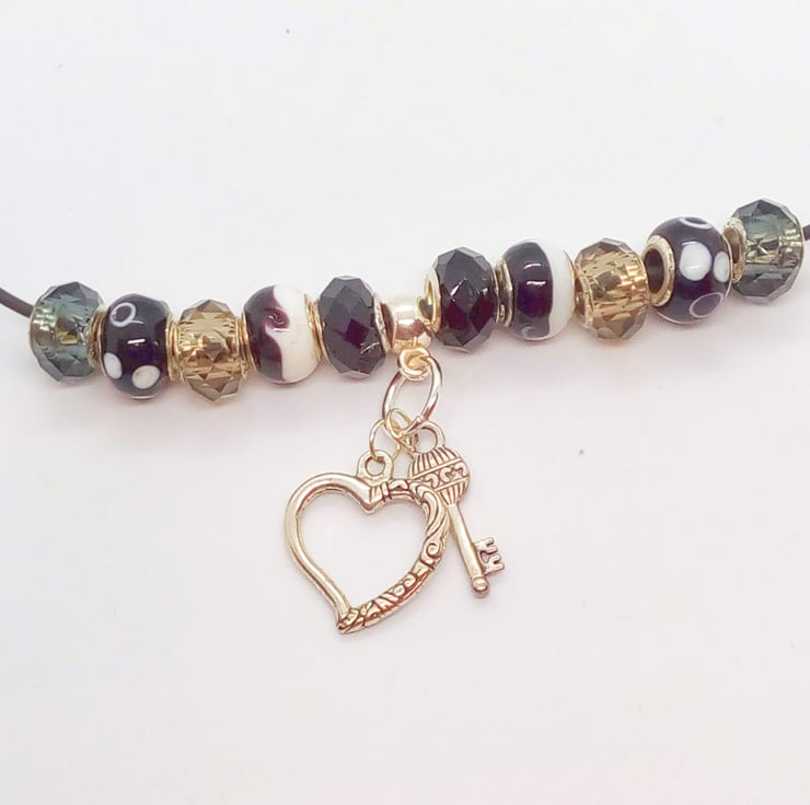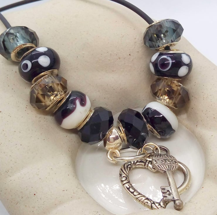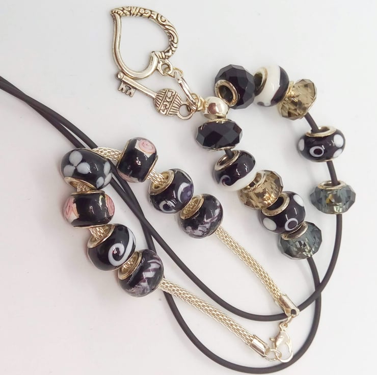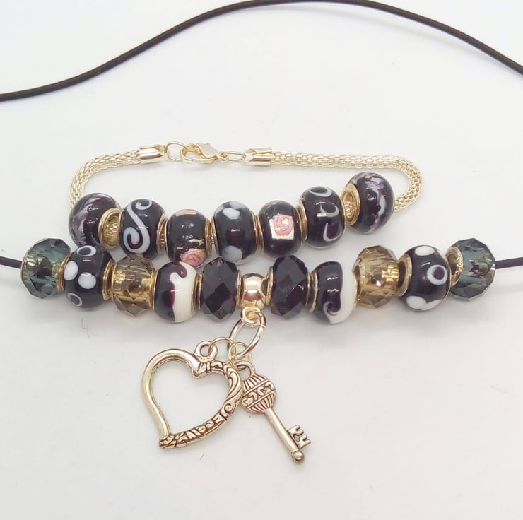 Black and White Lampwork Bead Jewellery Set With Key & Heart Charms, Necklace, Bracelet, Ladies Accessories, Birthday Gift, Anniversary Gift