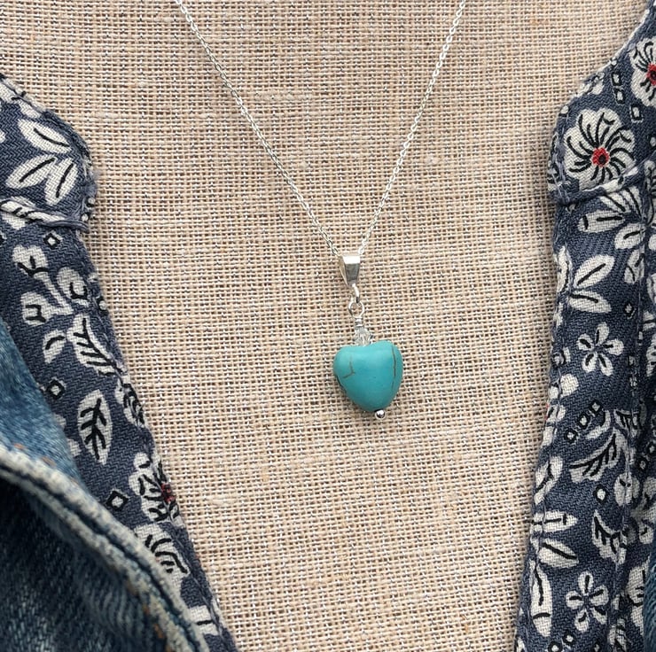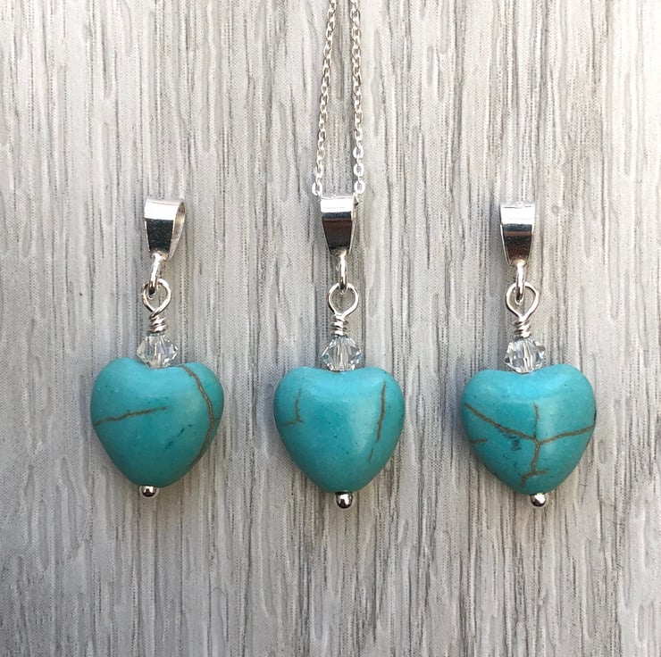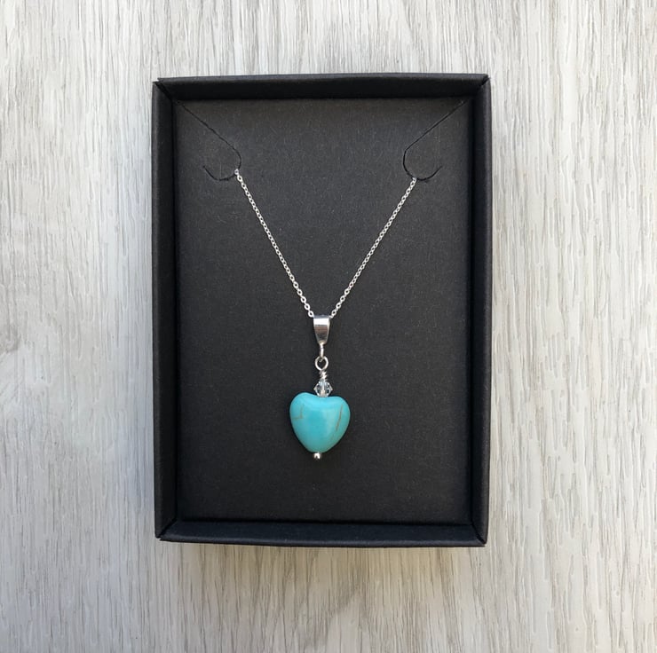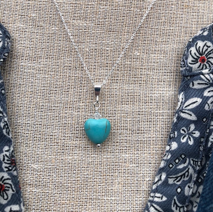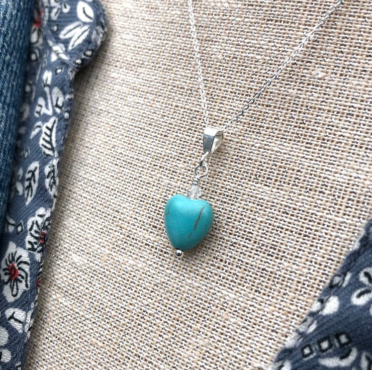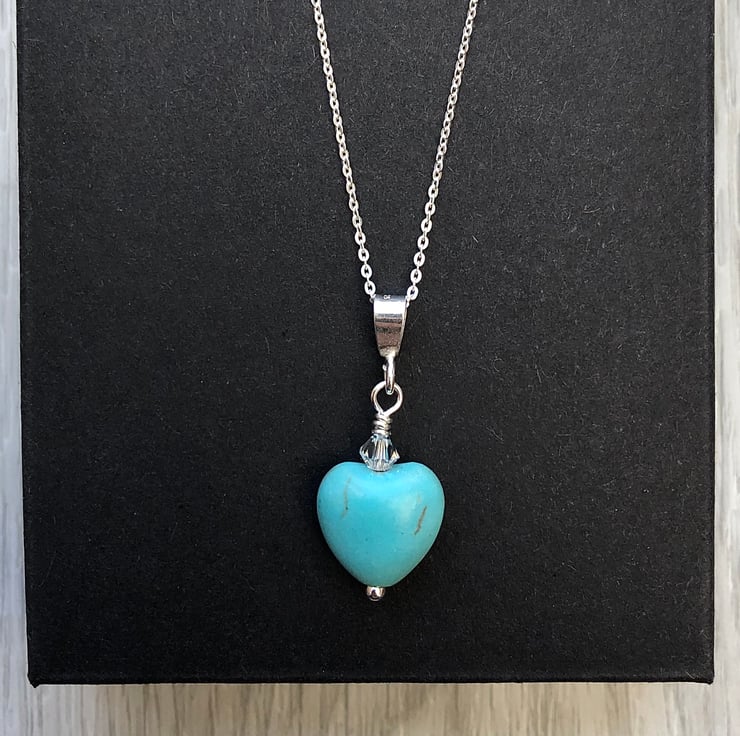 Sweet little semi precious turquoise heart and Swarovski crystal has been hand wired onto a sterling silver head pin. Hangs upon a sterling silver bail and hangs from an adjustable sterling silver chain which can be worn at 16 or 18 inch.