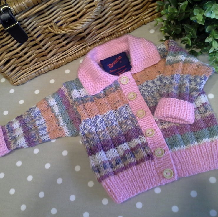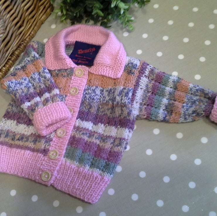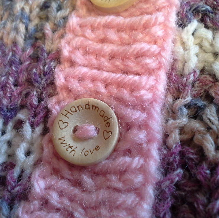 A very pretty attractive baby girls cardigan lovingly designed and hand crafted using quality branded machine washable yarns containing wool and cotton. The buttons are made from genuine wood with a sweet sentiment burnt etched on them. The solid deep pink yarn is a branded premium machine washable French manufactured yarn. The cardigan has the Demelza garment label attached to the back neck edge with the care instructions woven within it on the reverse side.