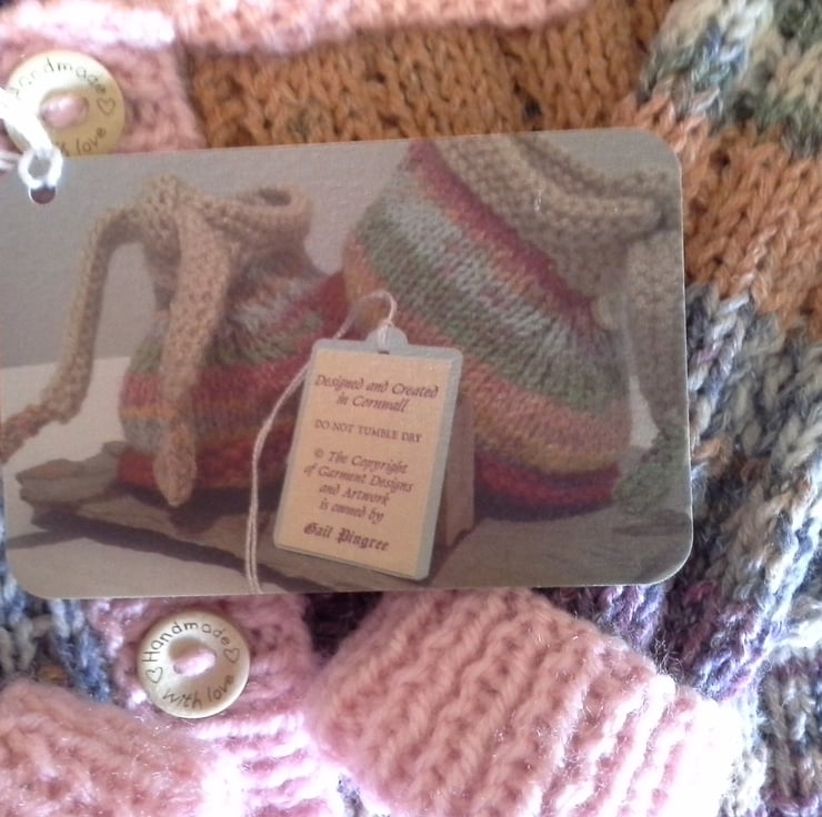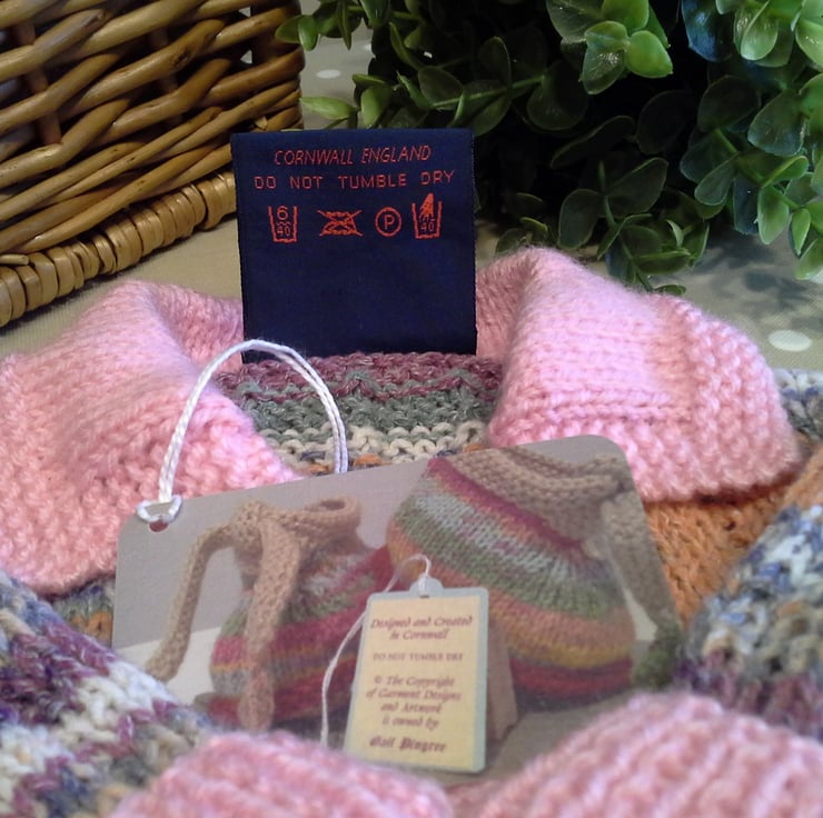 Baby knitwear is designed and hand crafted by Demelza Designs in Cornwall meeting UK baby safety standards, Only branded premuim acylic, acrylic/natural fibre blends or pure natural fibre yarns are used in baby knitwear which conforms to BS984/76 standards.