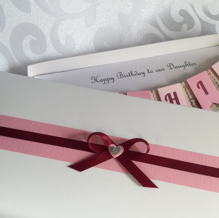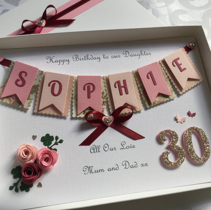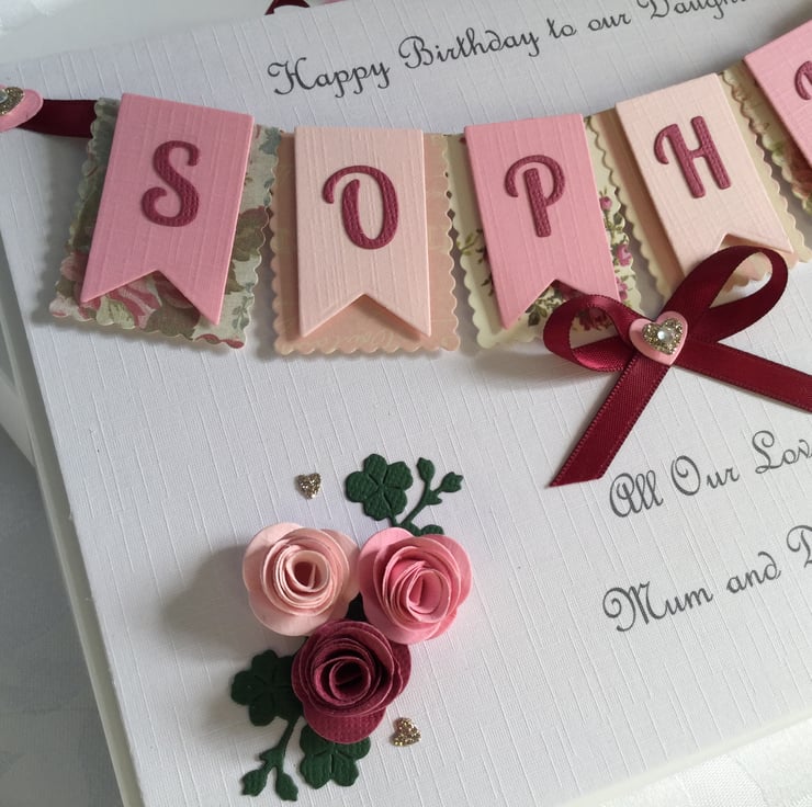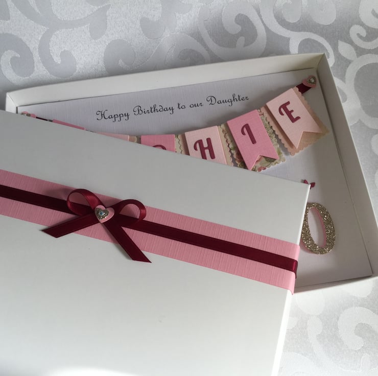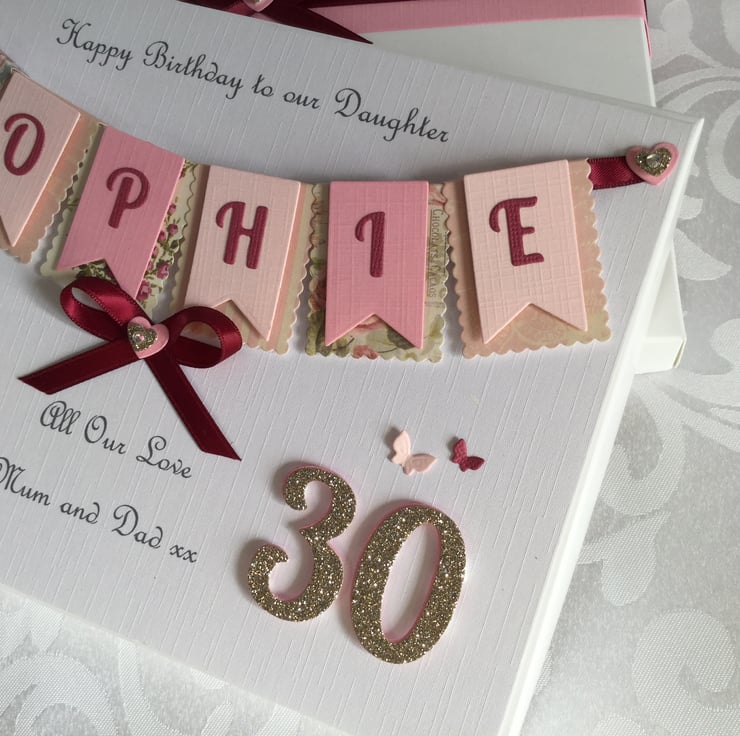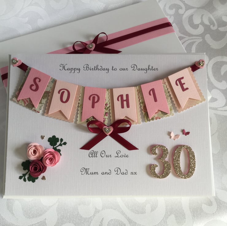 This handmade personalised card is A5 in size ( 210mm x 150mm) and is on 300gsm heavyweight linen cardstock. A name of up to seven letters can be made on the bunting. This card can be for any birthday or special occasion. Any age can be put on the card in large numbers or this can replaced with butterflies.