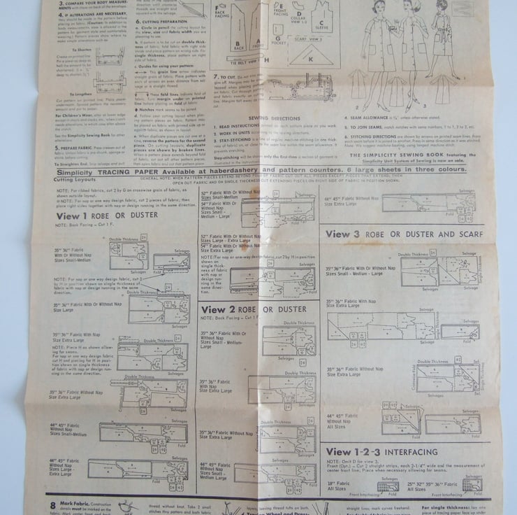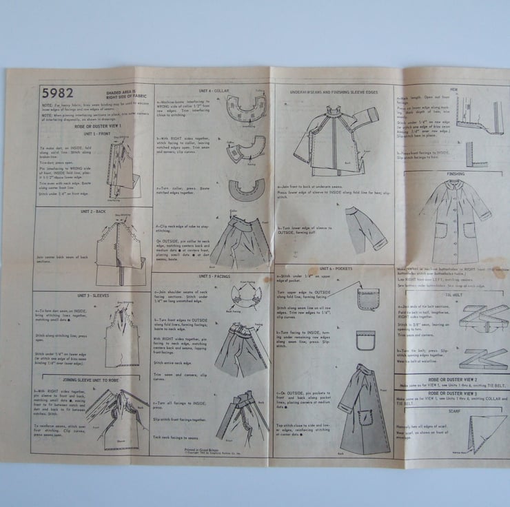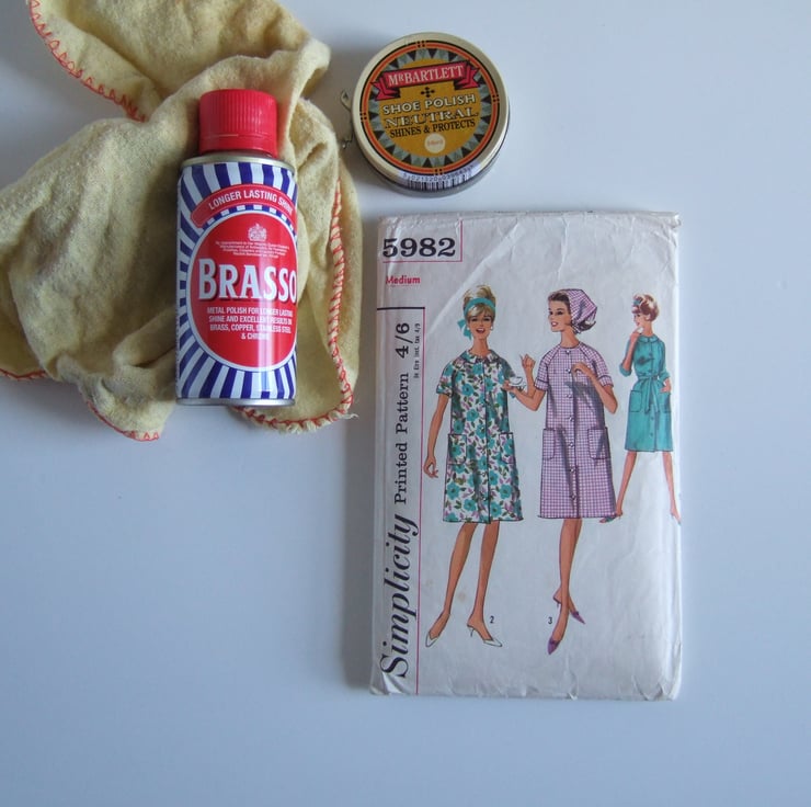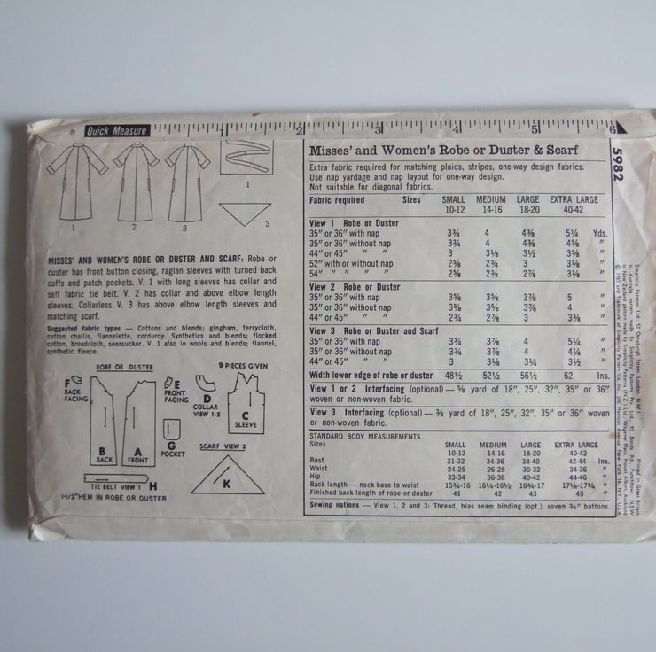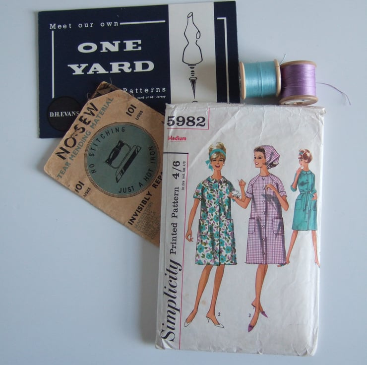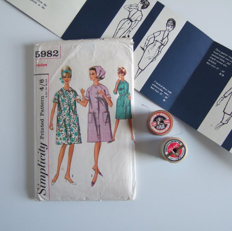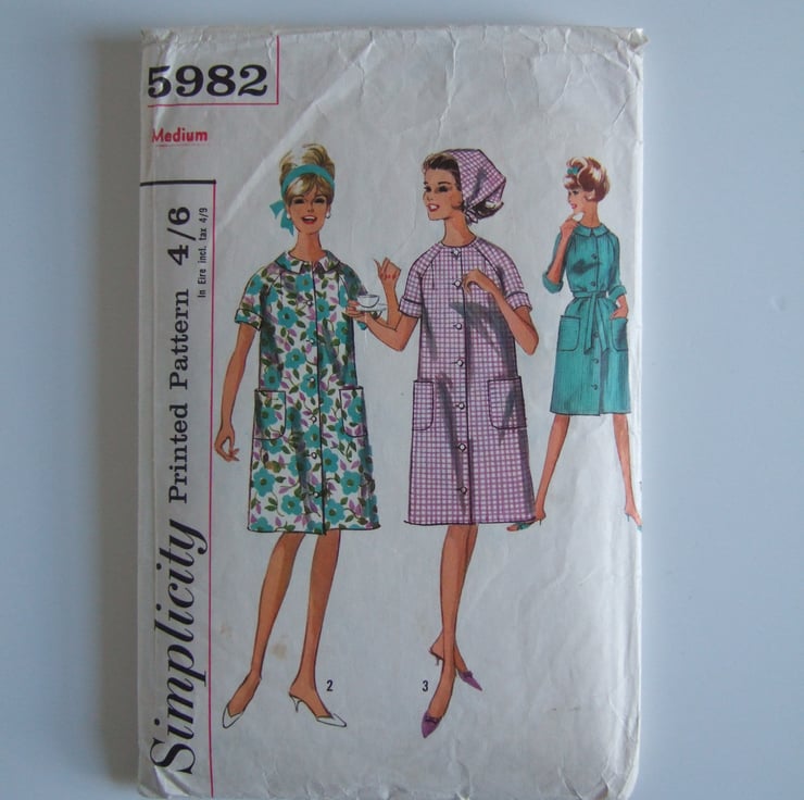 A lovely vintage sewing pattern for a duster coat or robe. Hard to belive that this was designed and printed in 1965.These practical garments were worn during the day to protect everyday clothes from the dust of housework. They were often homemade, and made up with bright and breezey fabrics to cheer up the daily cleaning routine. This pattern has been used, but all the pieces are intact and in good, tho second hand, condition. The envelope is turning a sepia colour! and is a little crumpled, but the great period fashion illustration still shines out. These vintage dress making envelopes can also look great framed in groups and up on the wall. This would make a great present for a vintage lover, a fashion historian, or a dressmaker.
