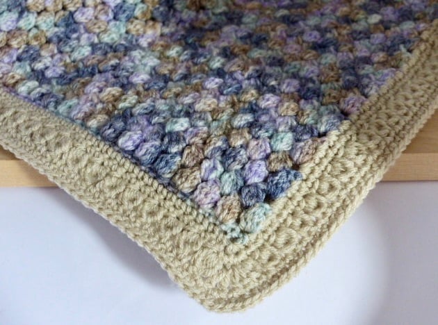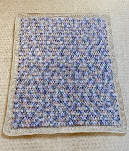 A baby blanket in a lovely double knitting 'Stonewash' effect yarn in a lilac colourway with a wide plain border in a parchment colour. The blanket measures approximately 70cm x 60cm (27" x 24") so would be ideal for a pram, pushchair or moses basket. The colour would be suitable for a baby boy or girl. This item will be sent by Royal Mail.