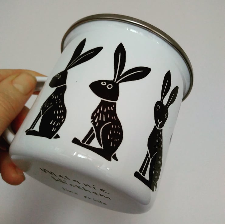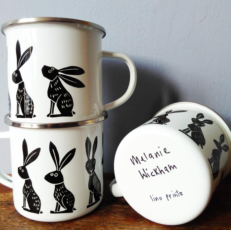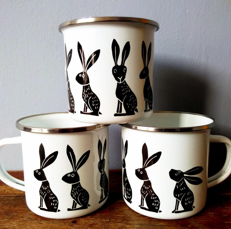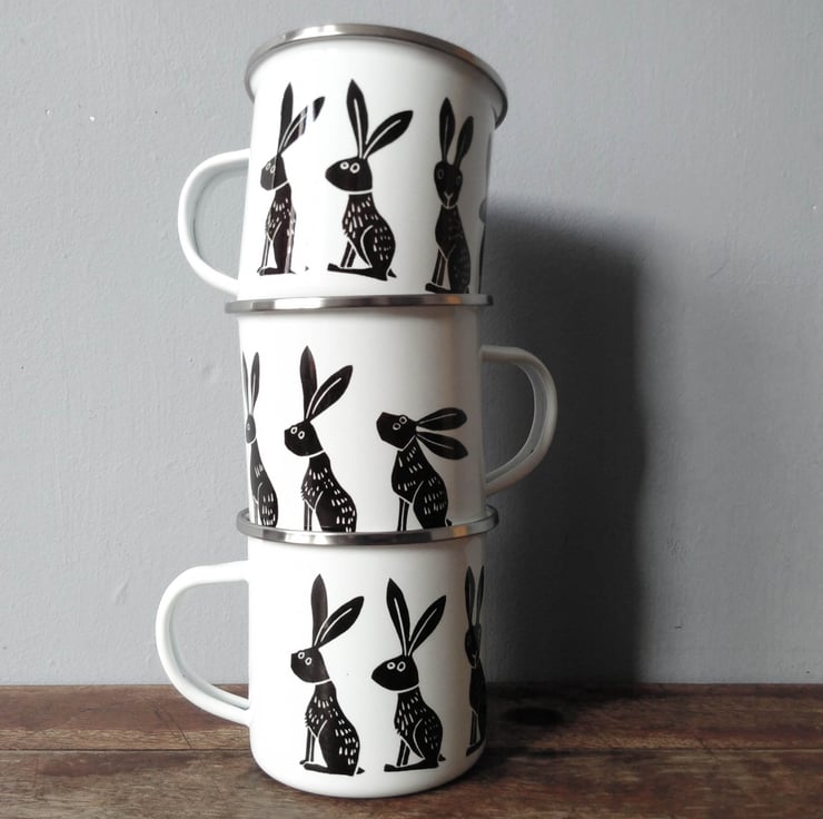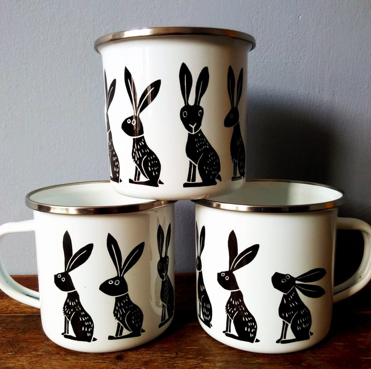 An enamel travel or camping mug illustrated with my popular Hares lino print. Six lovely hares wrap around the mug making drinking hot drinks on the go even more fun.