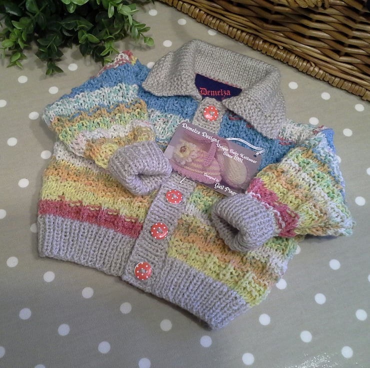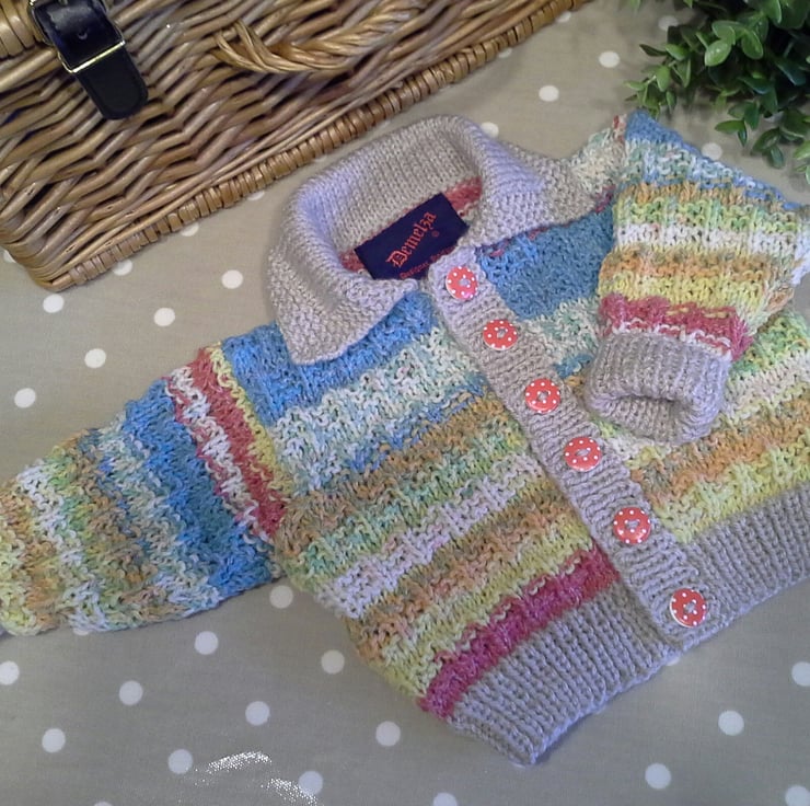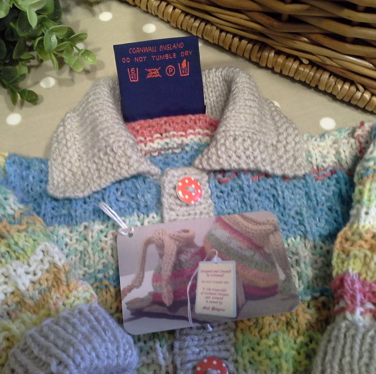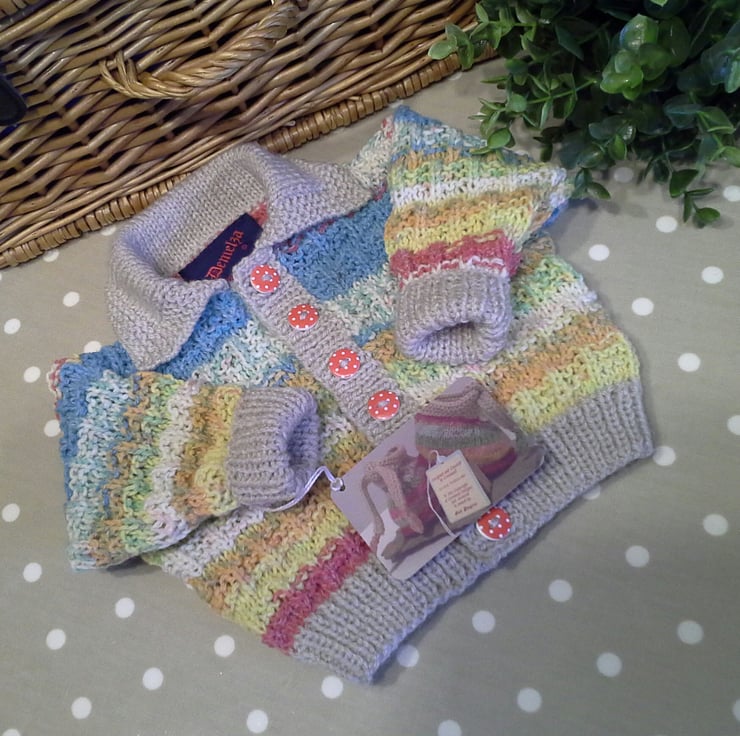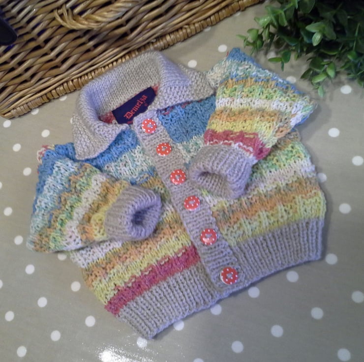 A sweet colourful baby cardigan lovingly designed and totally hand crafted using quality branded yarn containing natural wool and cotton fibres. The sold fawn coloured yarn is branded premium British manufactured acrylic. The buttons are made from genuine wood with a polkadot design on them. The cardigan has the branded Demelza garment label attached to the back neck with the care instructions woven within it on the reverse side.