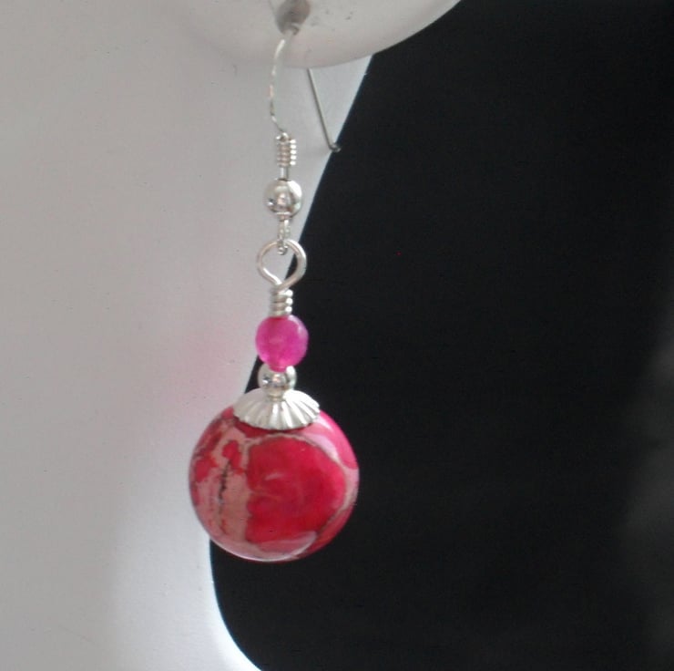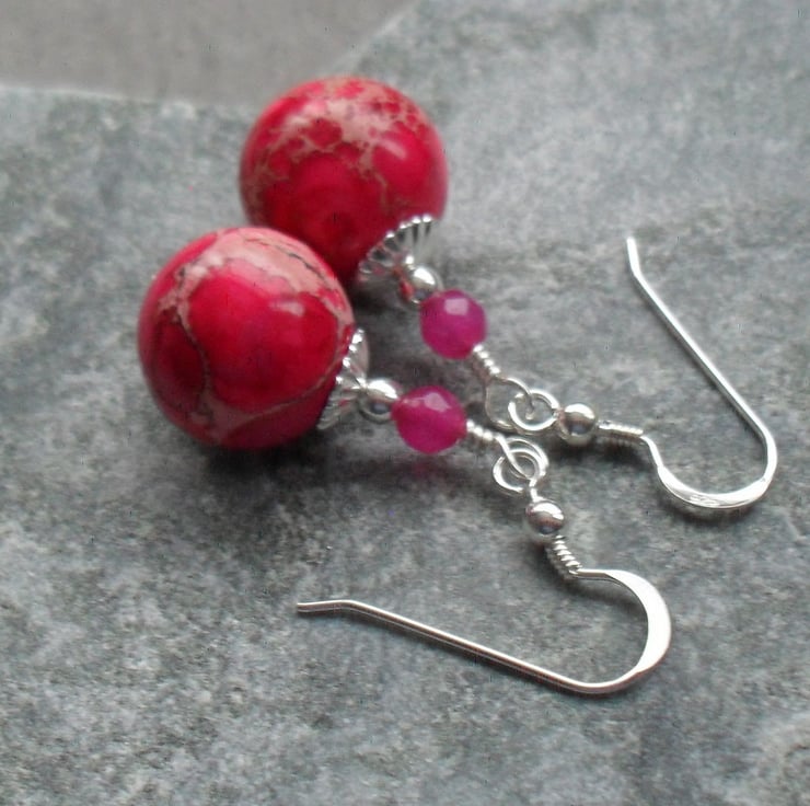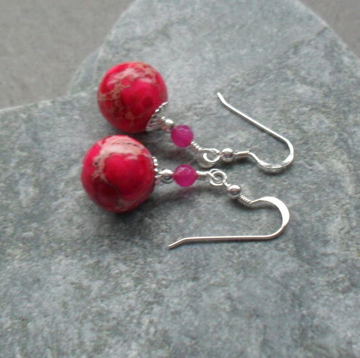 Shades of bright pink dyed terra jasper semi precious gemstones, small dyed pink quartz beads and sterling silver beads are attached to sterling silver ear wires