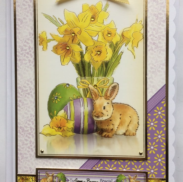 This is a cute luxury 3D greeting card to say Happy Easter to someone special. The design is a cute bunny rabbit sitting next to a vase of daffodils and Easter eggs, all of which have been gold foiled and 3D layered onto the card. The 3D sentiment on the front of the card says "To Some - Bunny Special". The card has been finished off with gold gems and a yellow ribbon bow.