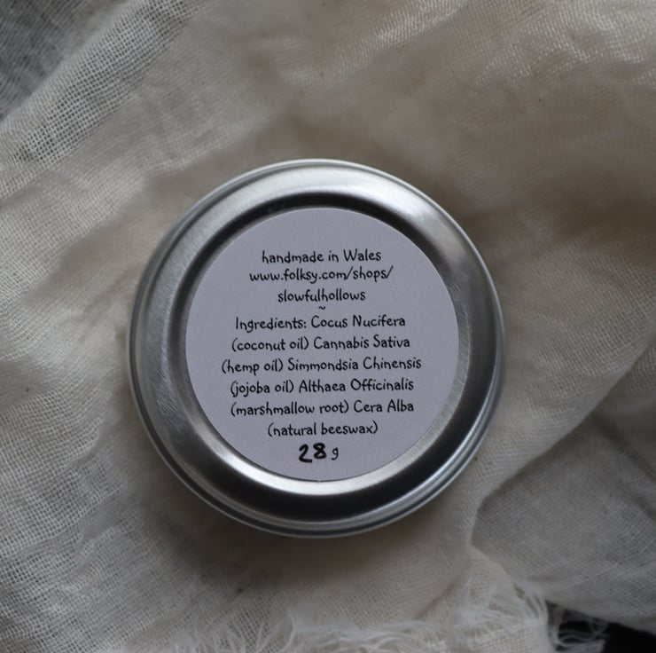 contains: unrefined organic coconut oil, organic hemp oil, organic golden jojoba oil, organic marshmallow root (infused into the oils) and 100% natural beeswax.