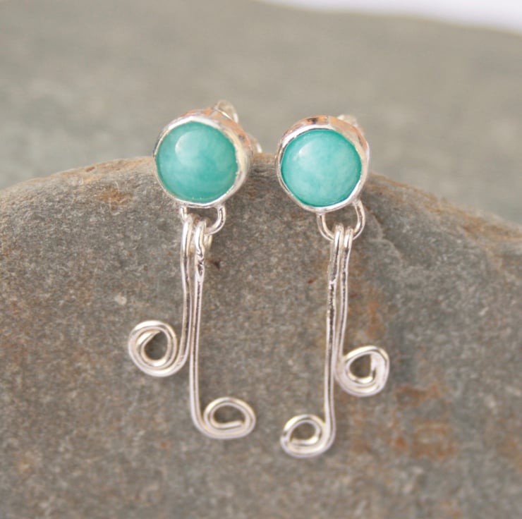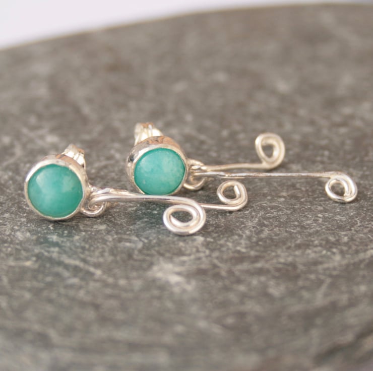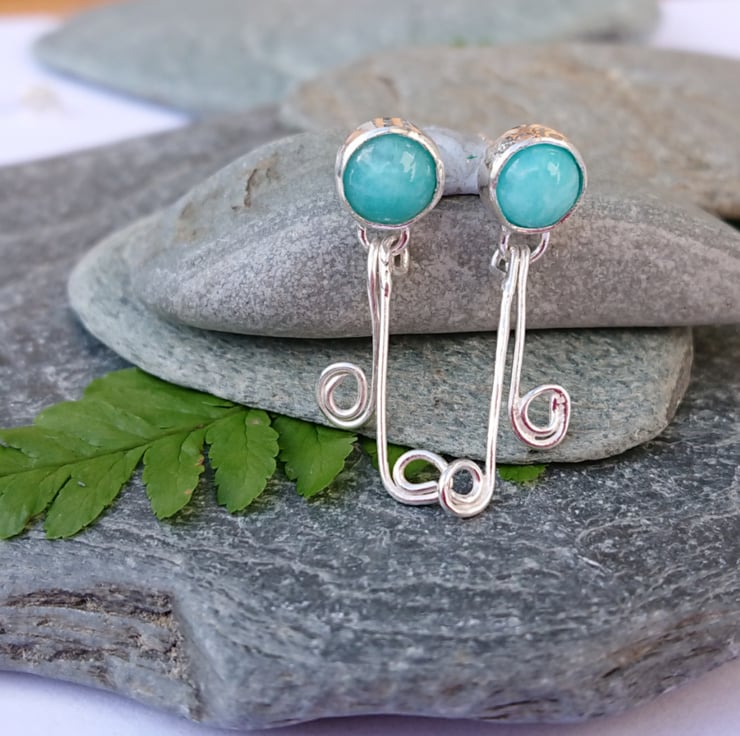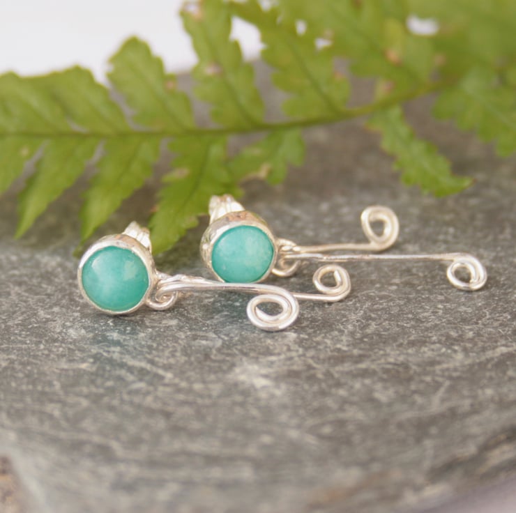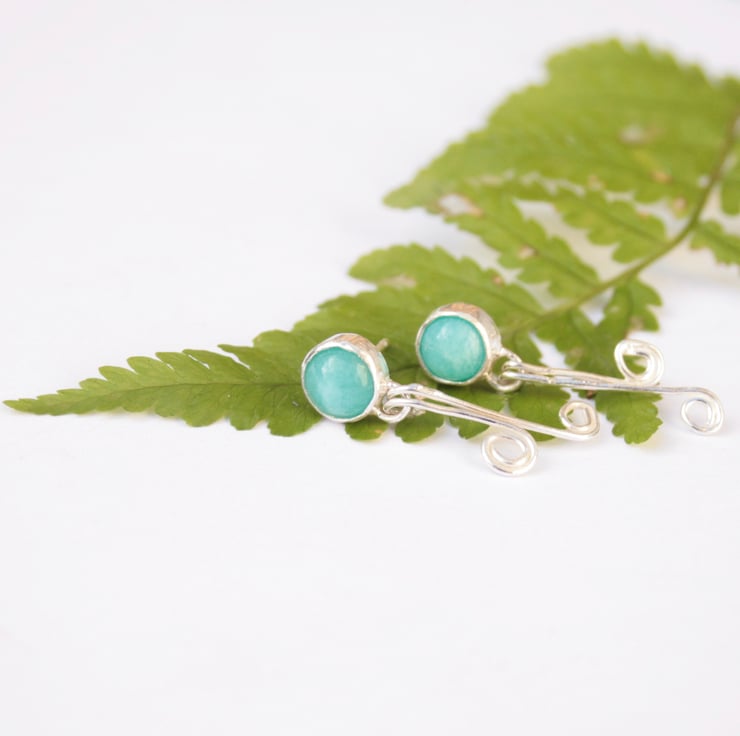 The design of these silver earrings was inspired by a fern uncurling as it grows into a fully formed leaf. An amazonite gemstone is set in sterling silver and from it hangs two 'fern tendrils', these are of different lengths and are able to move freely as it's worn.