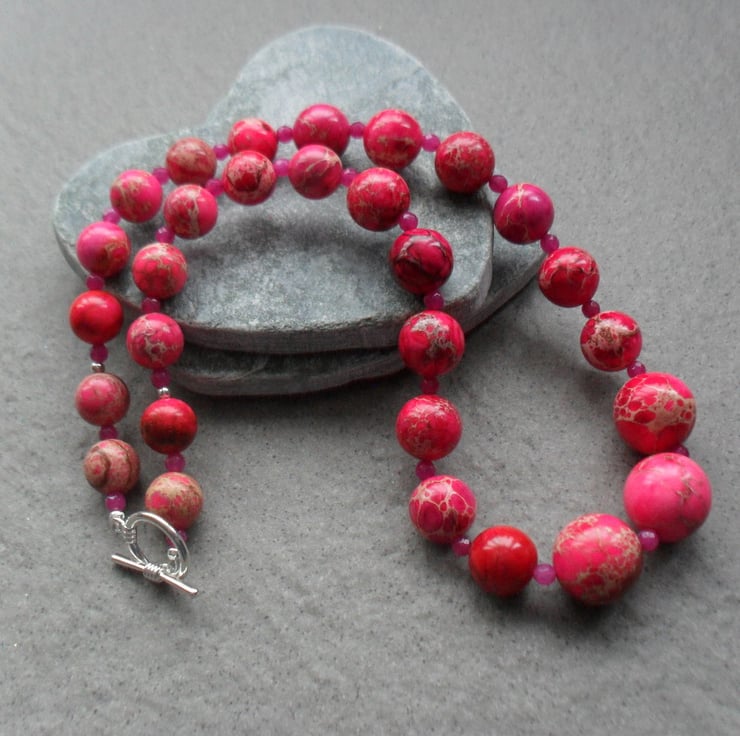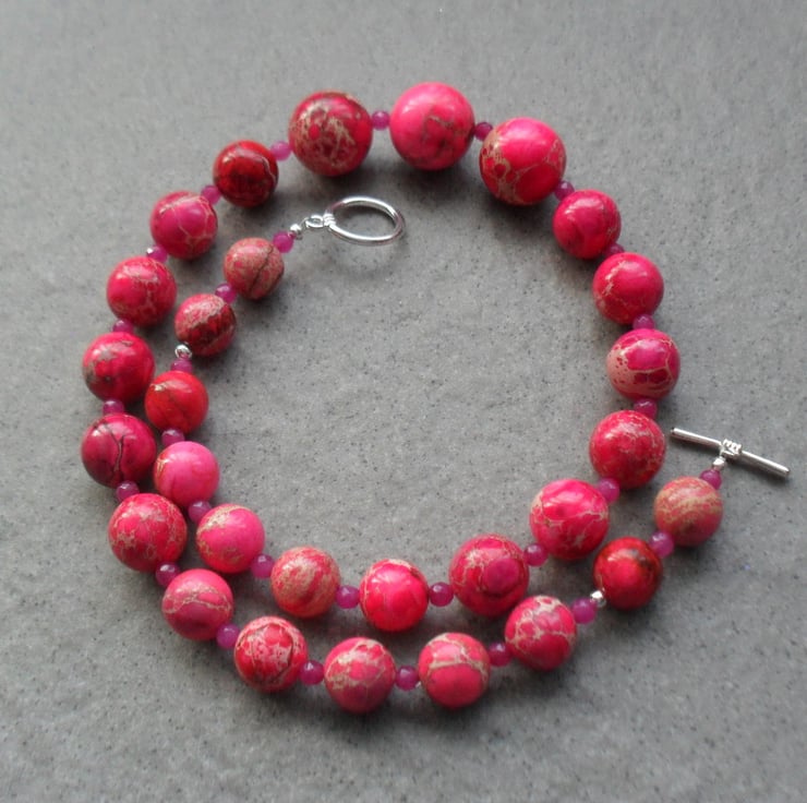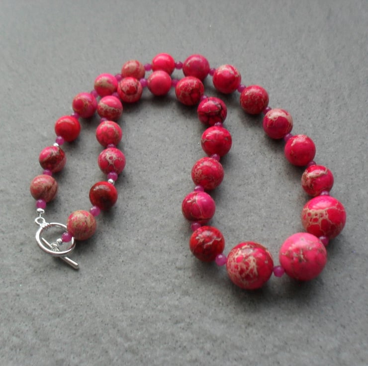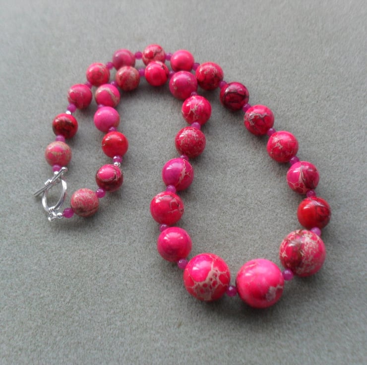 Pink terra jasper which have been dyed semi precious gemstones and small pink dyed quartz beads are beaded onto beading wire and attached to a silver plated toggle clasp