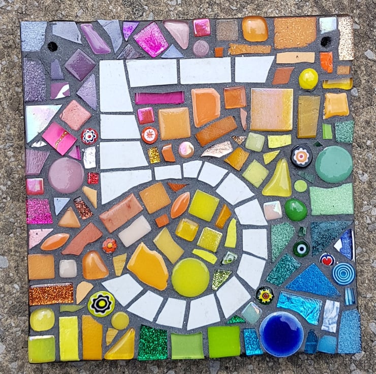 The mosaic pieces are usually a mix of coloured glass, mirror, ceramic and broken crockery.