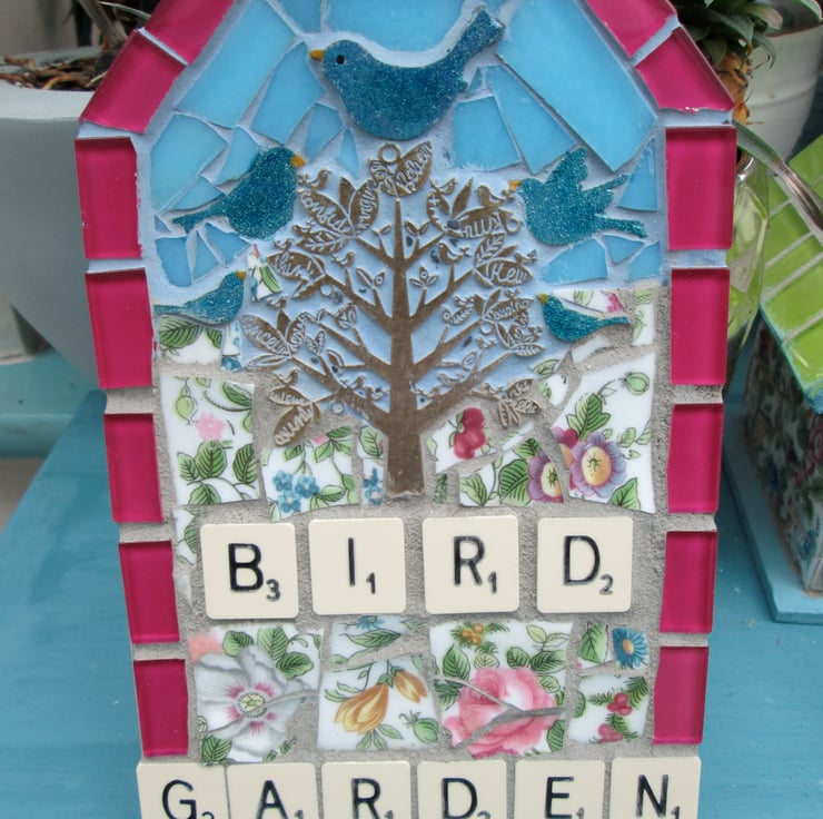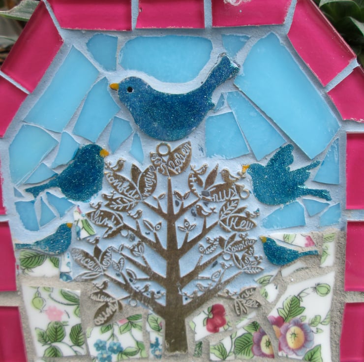 This sign is made from mixed media small birds and a tree. it can be hung in a garden or inside. It is 12cm x 20cm in size with a ribbon to hang up.