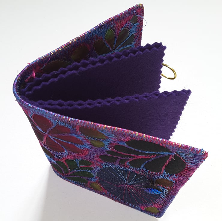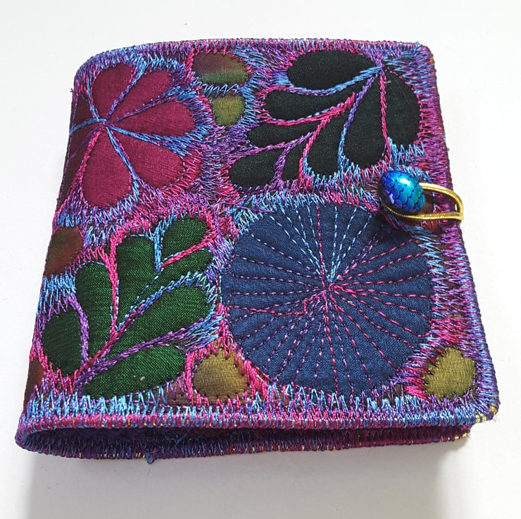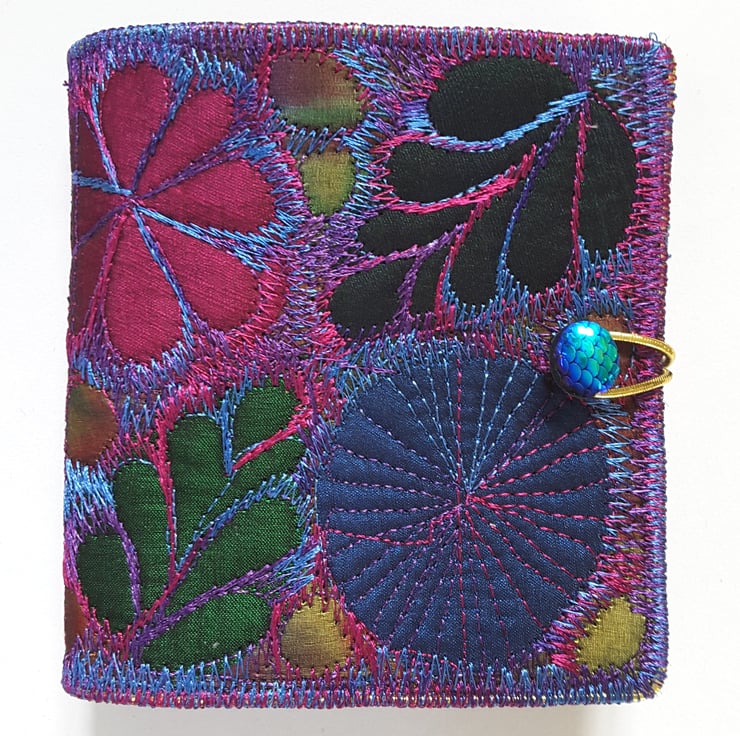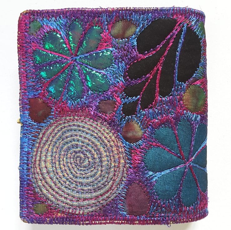 Made from layers of fabric including hand dyed Egyptian cotton and silk fabrics using the free machine embroidery style of sewing