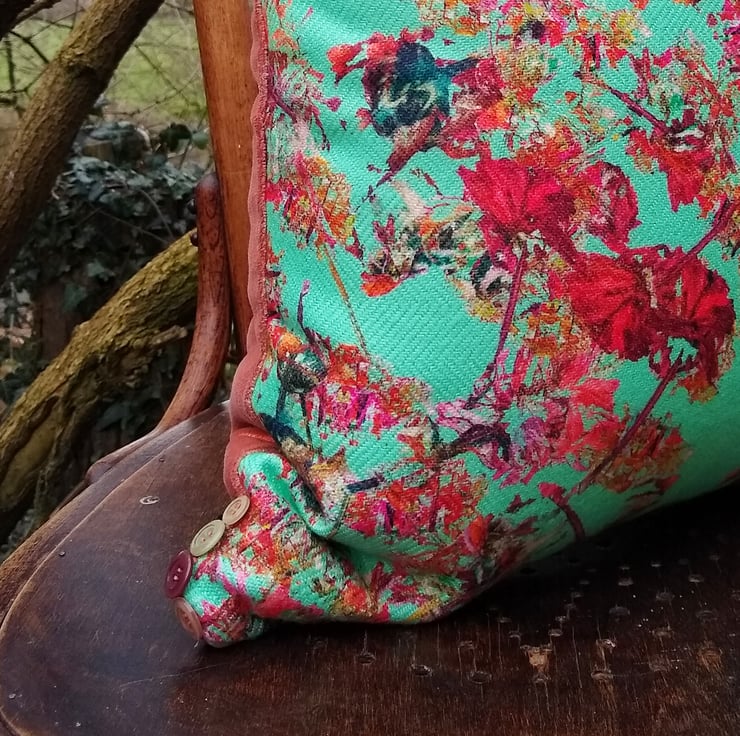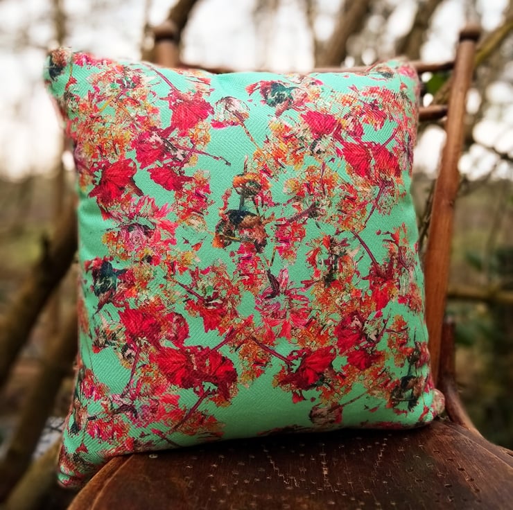 A vibrant green cushion with bright red flowers. The original design is printed digitally onto herringbone tweed, fully lined in a taupe satin cotton with a warm dusky coral velvet back.
