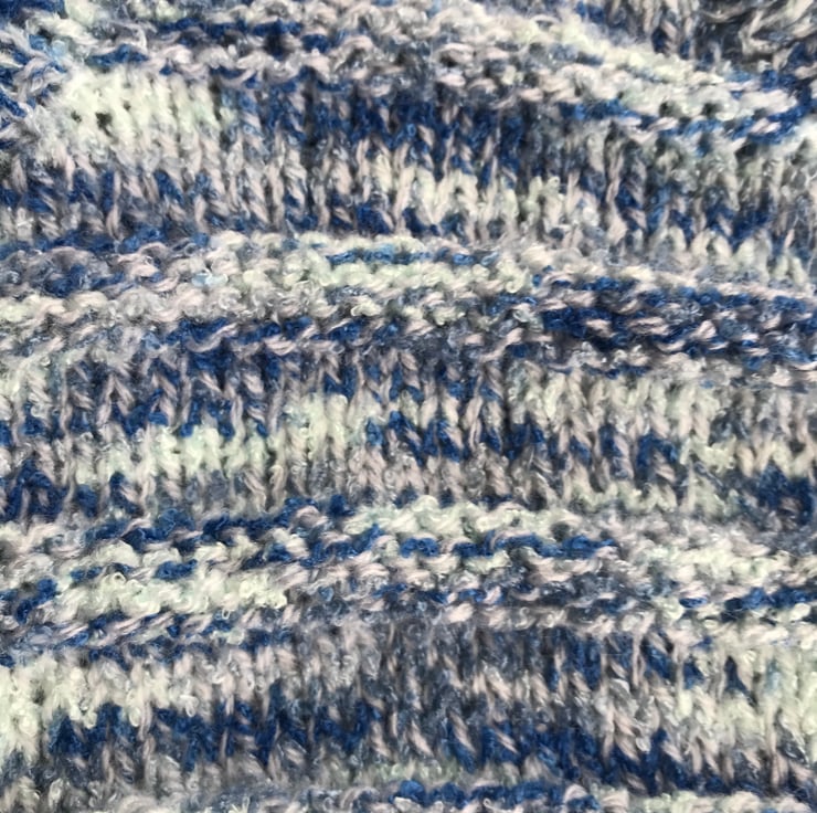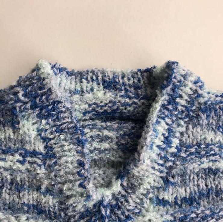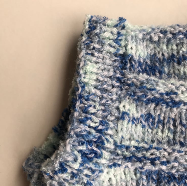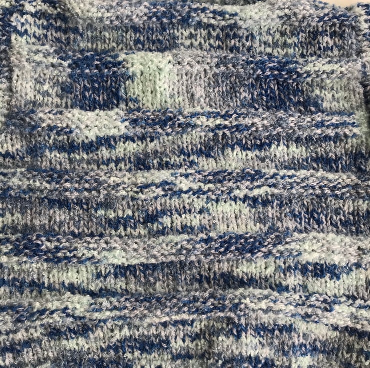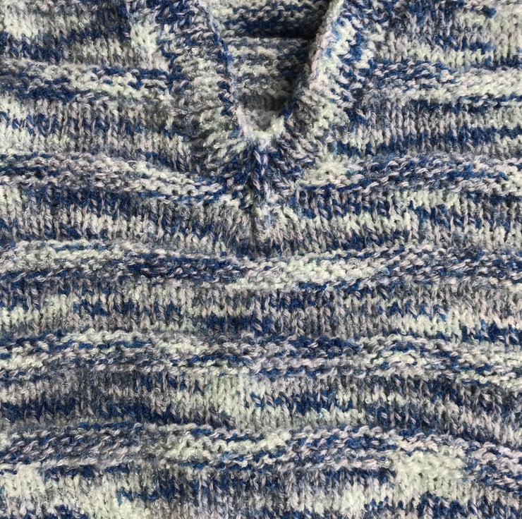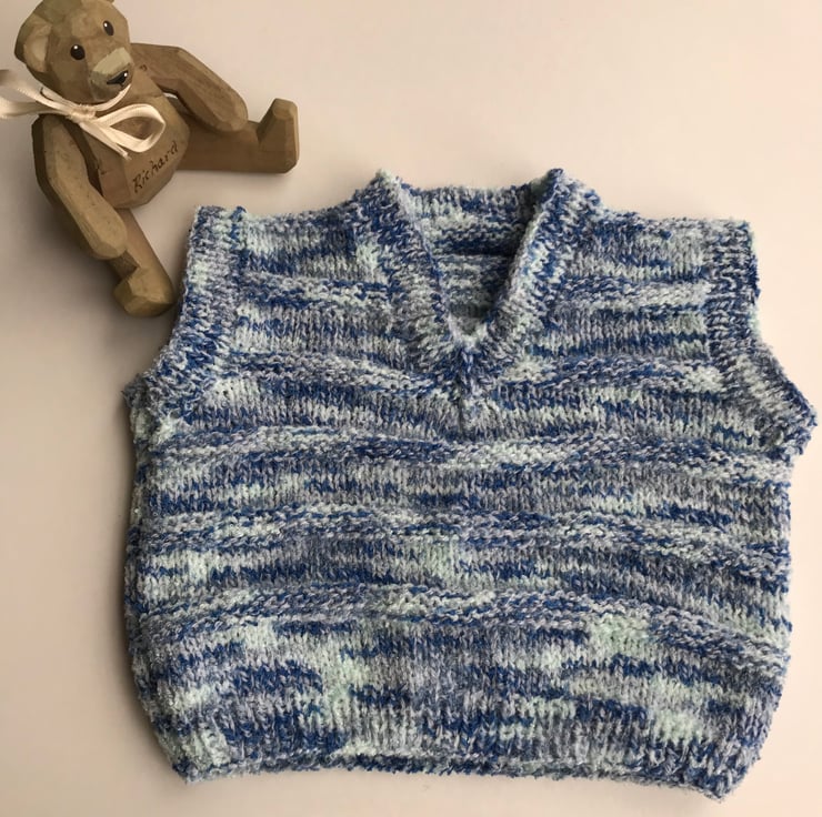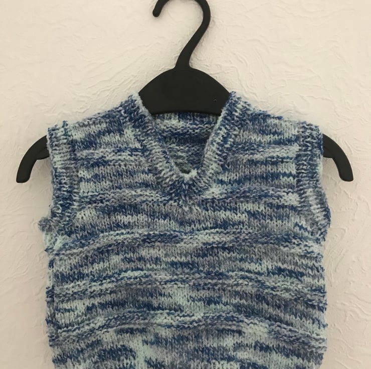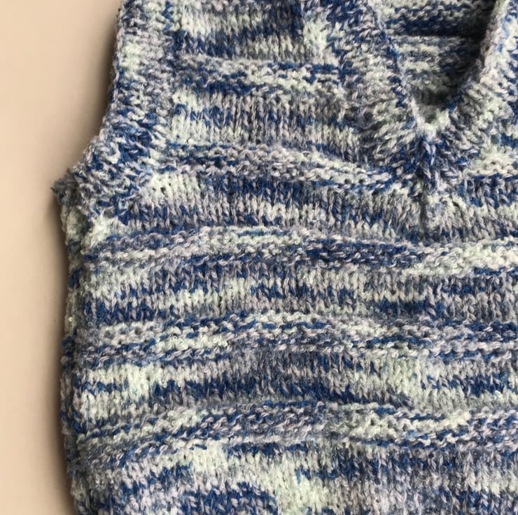 This handknitted sleeveless top is worked in a soft, textured, variegated yarn in shades of blue. The yarn is very light and springy and is ideal for adding an extra layer over tops. It has a v-neck and has bands of reverse stocking stitch front and back.