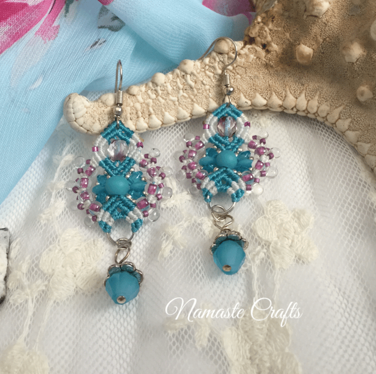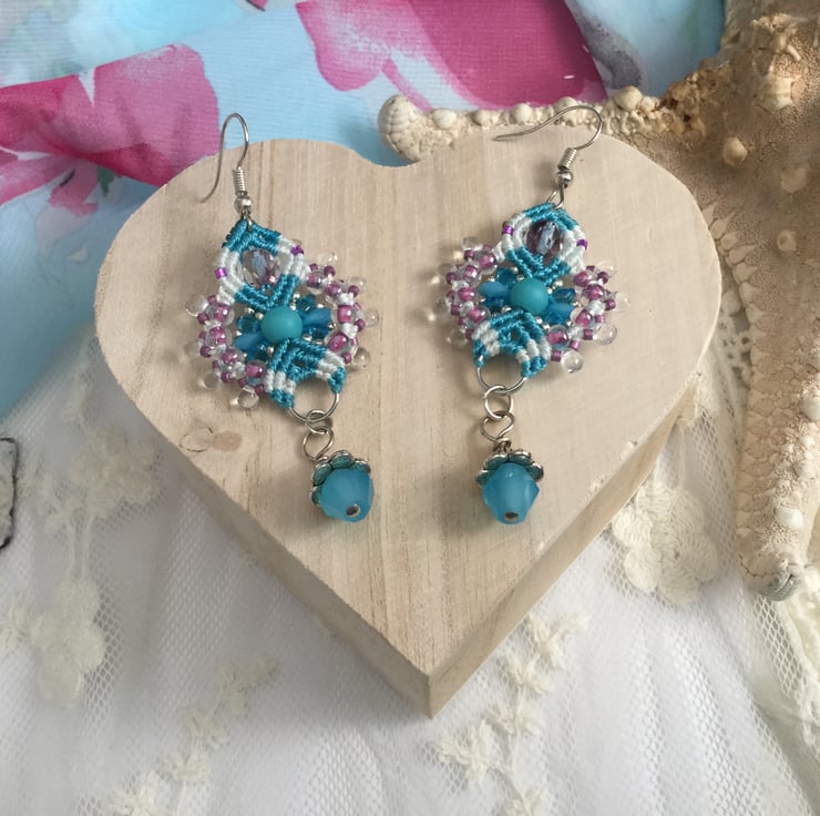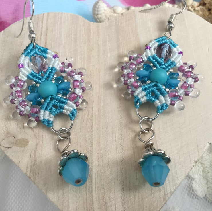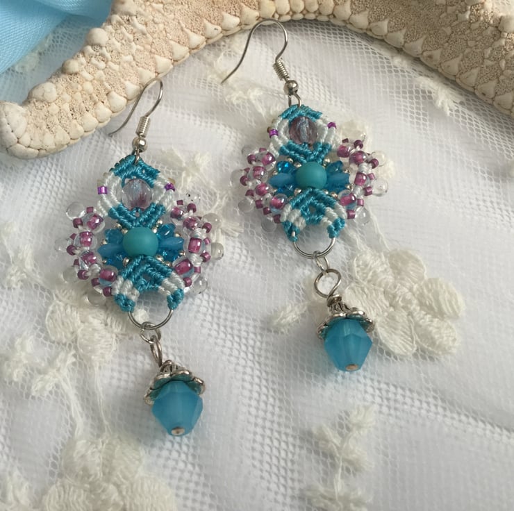 I have created these earrings using the delicate art of macrame using very fine C Lon thread in white and turquoise blue. All the beads are glass and of the highest quality sourced from around the world. The beauty with macrame earrings is that they are so light you hardly notice you are wearing them so you get the wow factor without the weight.