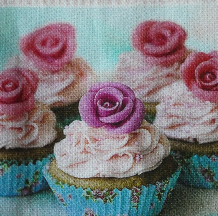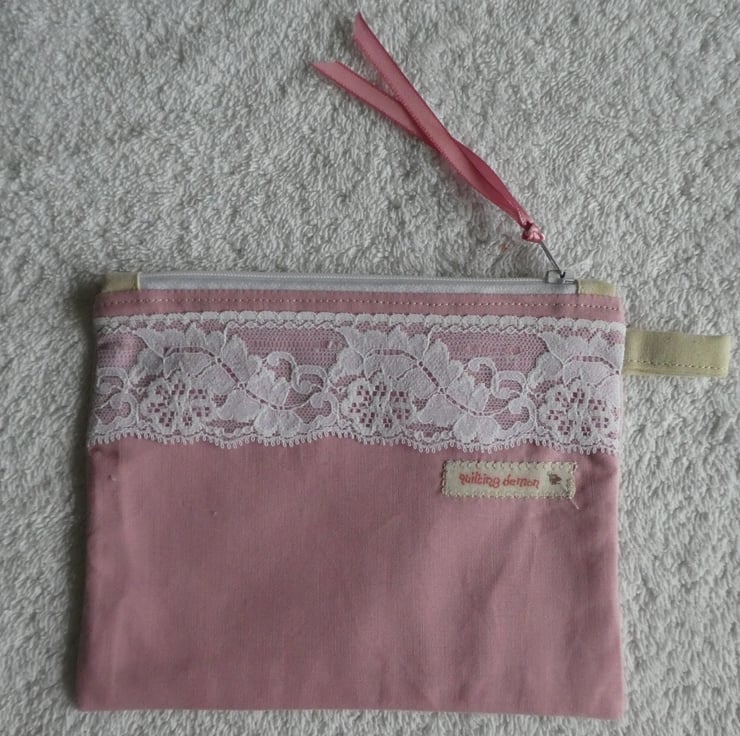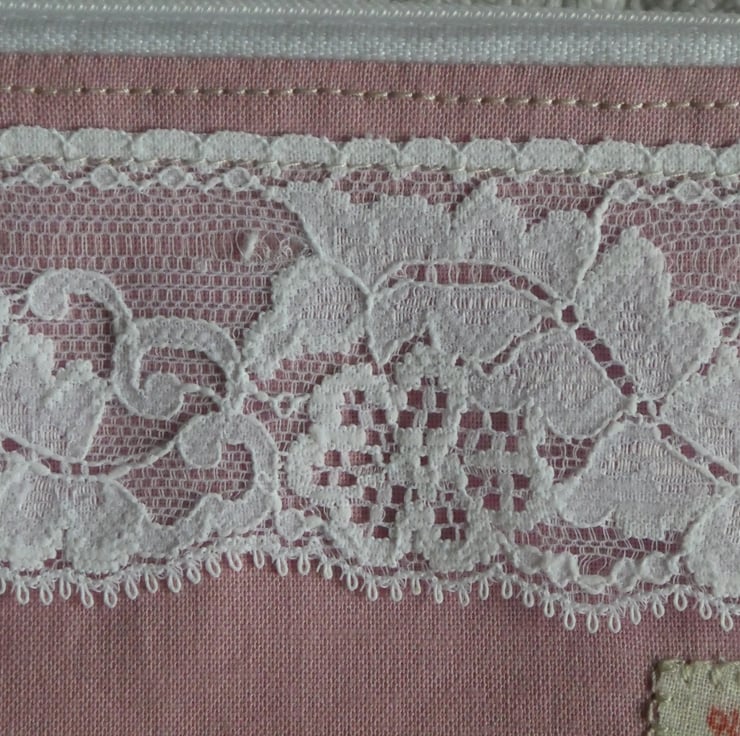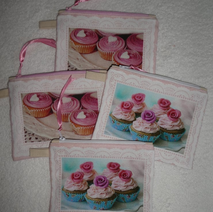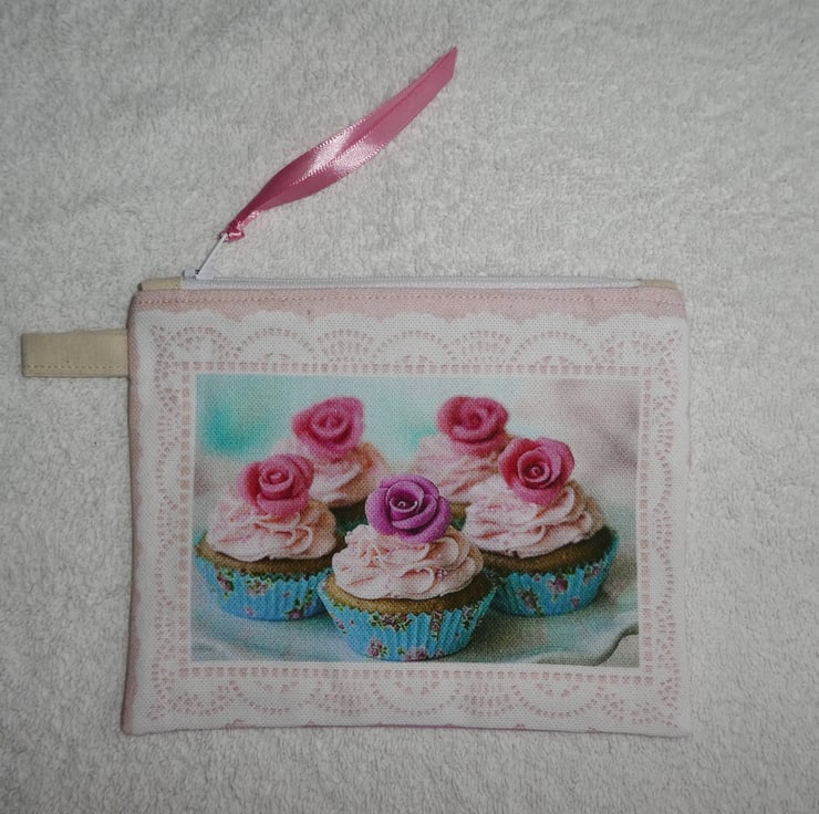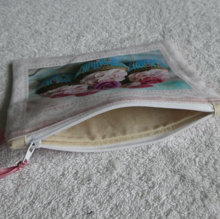 This lovely little purse has been created from a cup cake print cotton fabric. The back is made from a complimentary pink cotton, with white lace stitched on to match the front fabric pattern. It is fully lined in cotton and has a zip closure, with a ribbon pull.