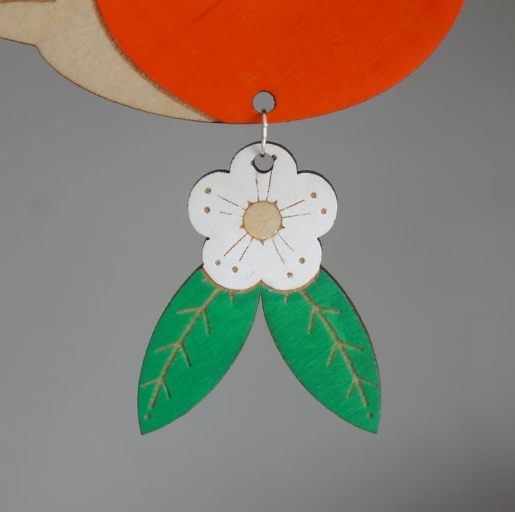He's cut and etched from 3mm birch ply and has been hand painted in the bullfinch's bright orange and black . He also has a little hawthorn flower with leaves, which hangs under his belly.