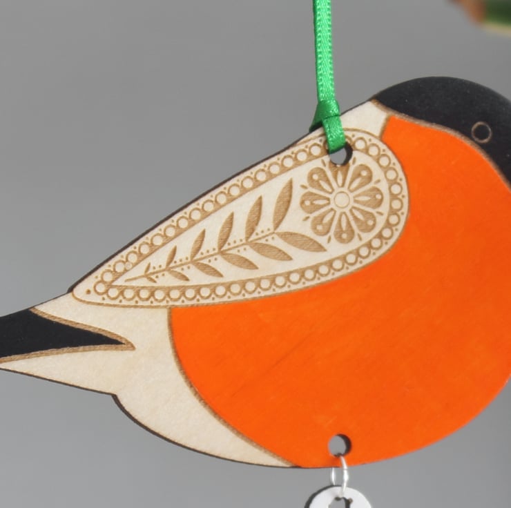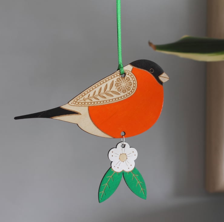 He's cut and etched from 3mm birch ply and has been hand painted in the bullfinch's bright orange and black . He also has a little hawthorn flower with leaves, which hangs under his belly.