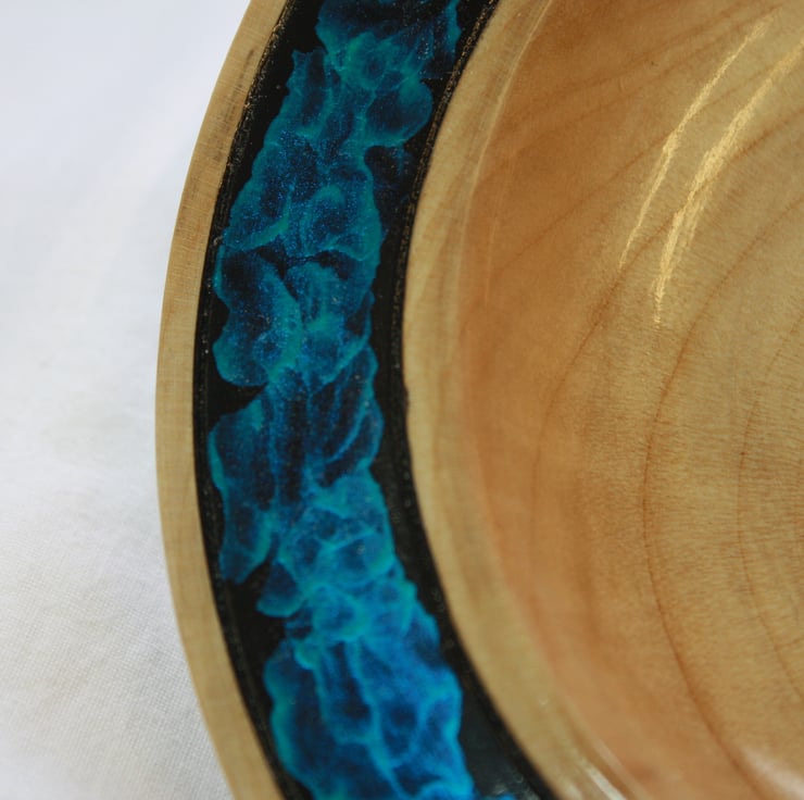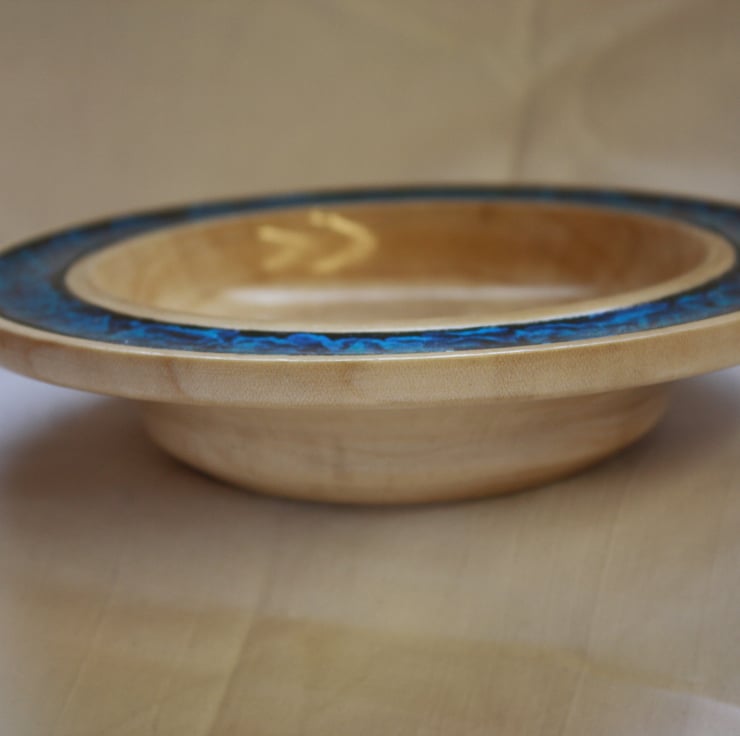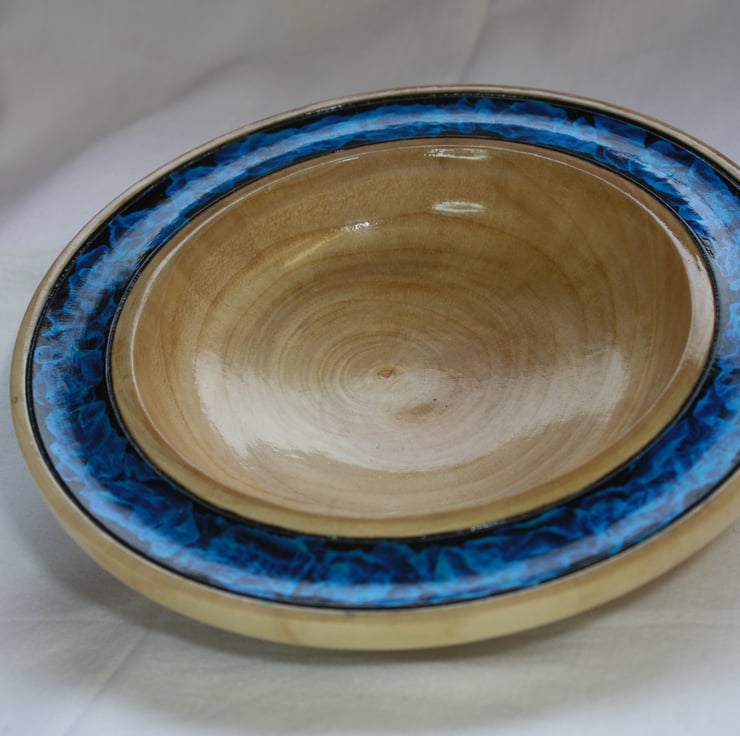 A piece of wood was selected and cut down to a suitable size then shaped on a woodturning lathe to a roughly finished final form. It was then sanded to a smooth finish. The coloured band on the dish was painted with black paint before the blue irridescent paint was applied. The blue started out as single droplets of paint before an airbrush was used to blow and spread out the paint to create the pattern that you see. The dish is smooth to the touch and has been finished with several coats of Lacquer to enhance the colours whilst also protecting the dish and highlighting the beautiful grain of the wood. The lacquer used is water and heat resistant, and toy safe.