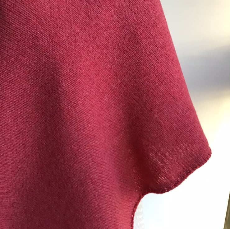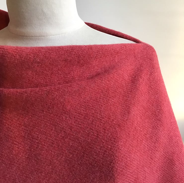 Simple asymmetric poncho in fabulously soft lambswool that drapes beautifully and is great to throw on over a t shirt. The colour is a subtle rose pink.
