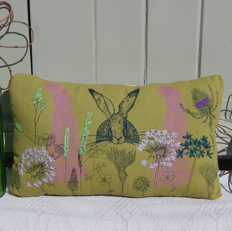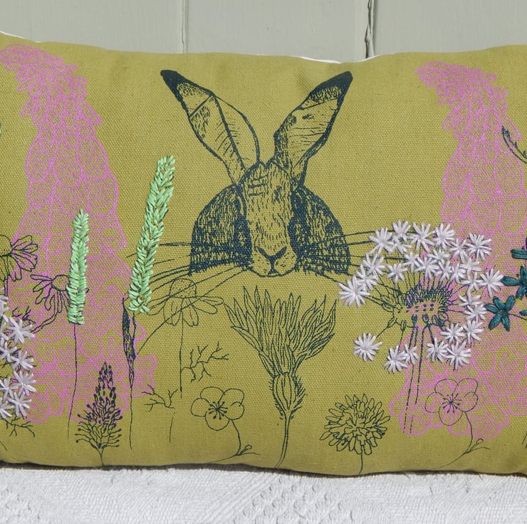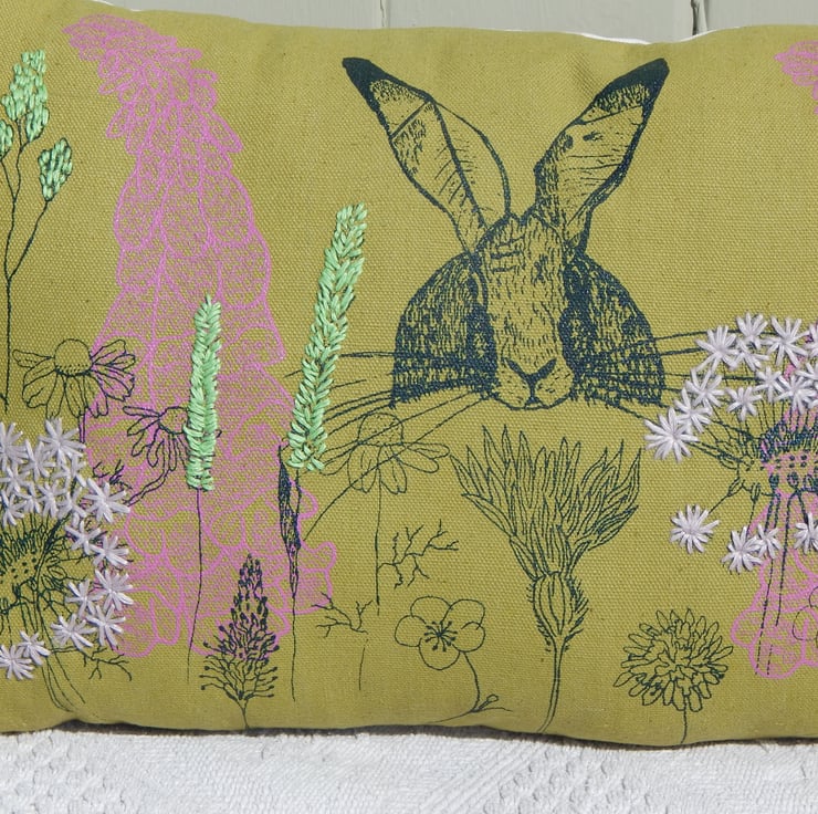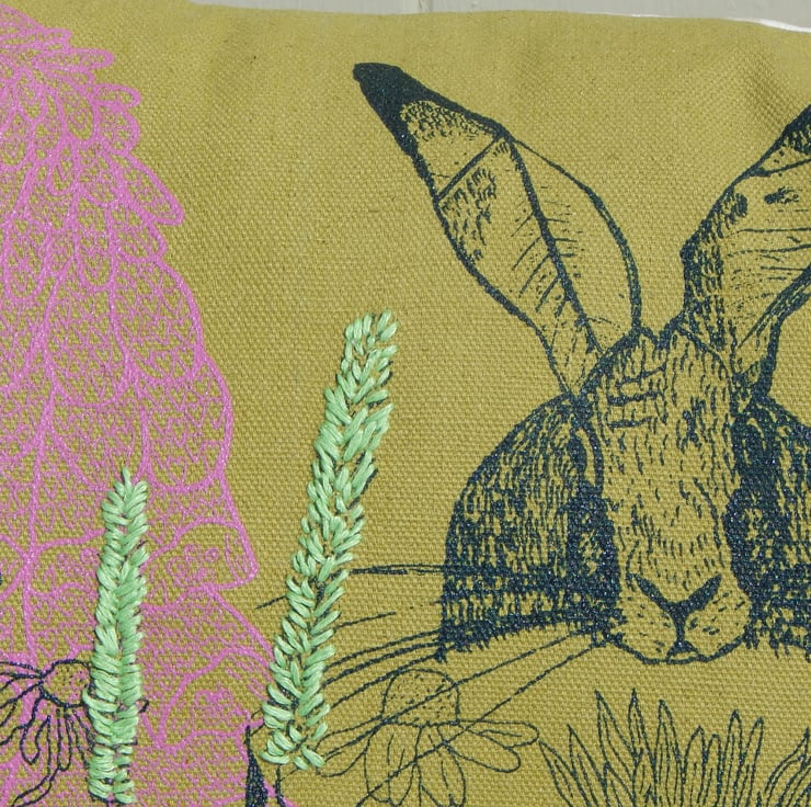 There is a hare printed in the middle of the cushion with patterned ears. This is based on a hare that I used to watch and photograph and I collected some leaves from his area and used them in the screen design to print with. There are then lots of wild flowers each printed individually with my smallest size screens, I place the screen, print, wait to dry and then place and print the next one. This gives a real individual one of a kind never to be repeated design, unique to this one cushion. The flowers include foxglove in pink, wild garlic, grass and dandelion clock. I have hand embroidered the wild garlic in green and the dandelion clock in an off white linen thread, also the grass and teasel is embroidered.