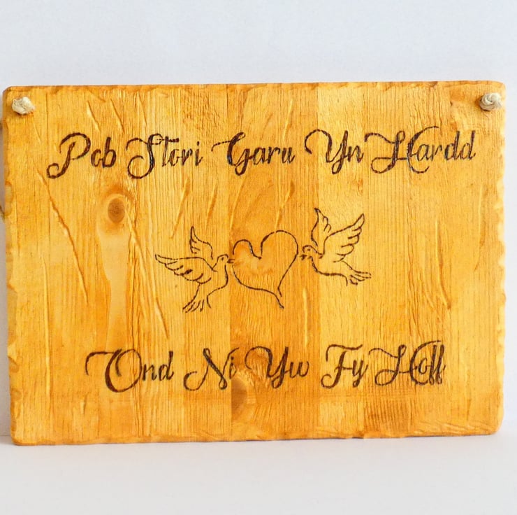 This rustic Welsh sign is a fun way to decorate any environment. (Every love story is beautiful but ours is my favourite). It has been upcycled from reclaimed wood. Ideal gift for an anniversary, birthday, Easter, or as a gift for her.