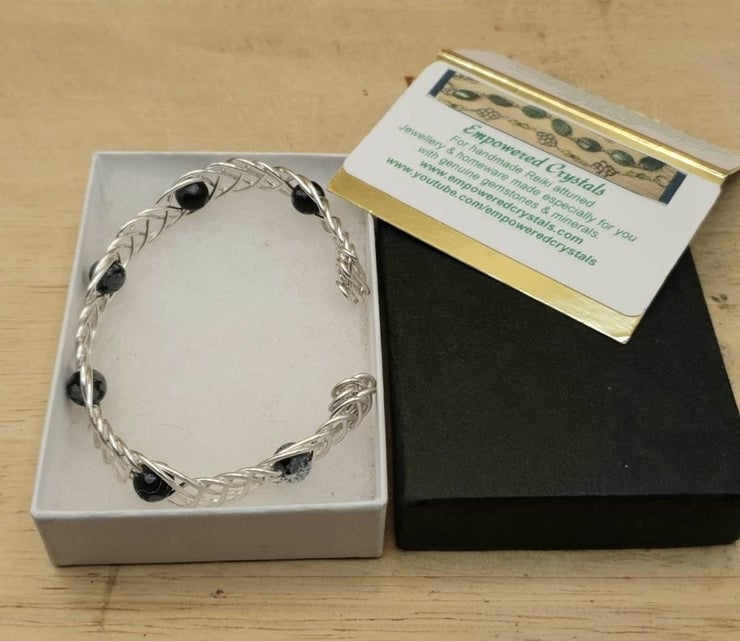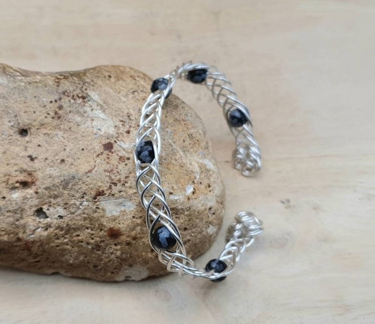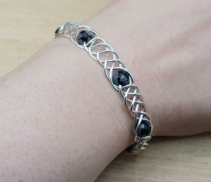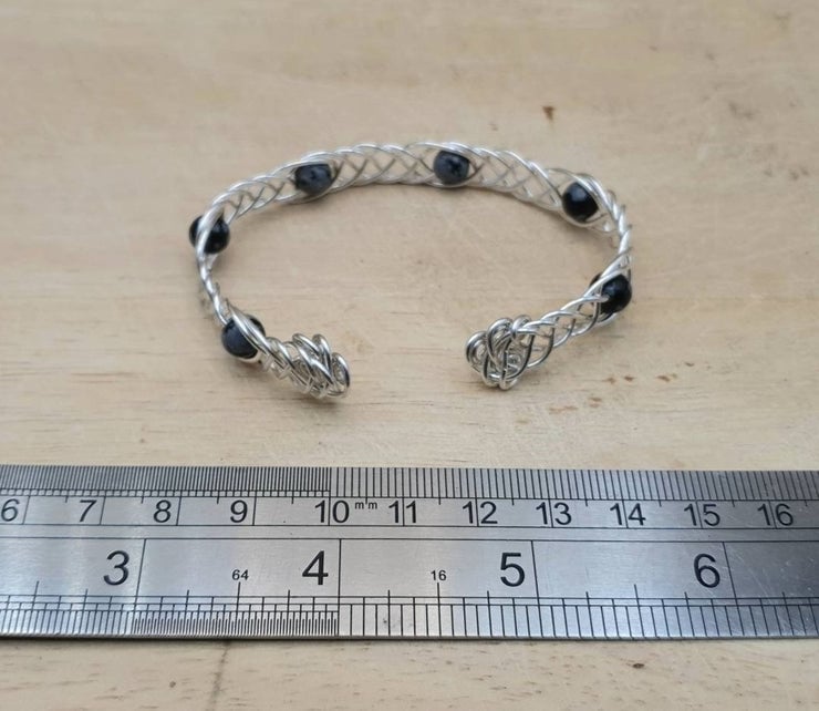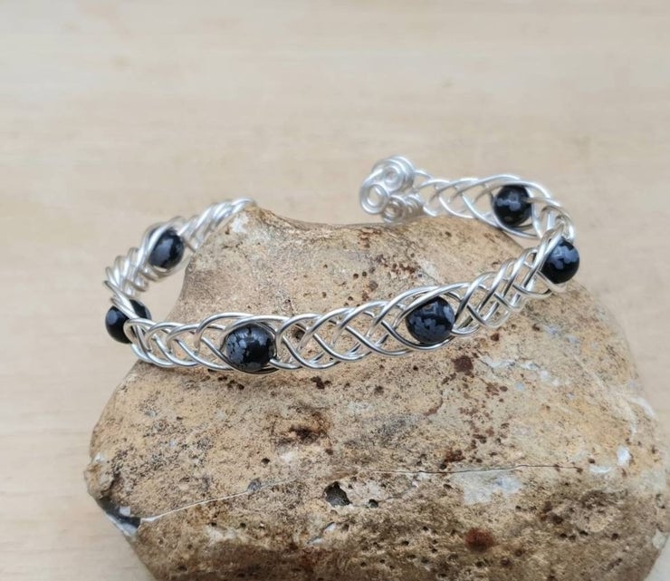 This is a Snowflake Obsidian adjustable cuff bracelet. Wire wrapped with silver filled wire.