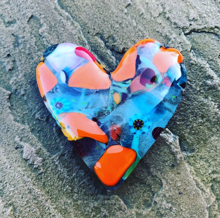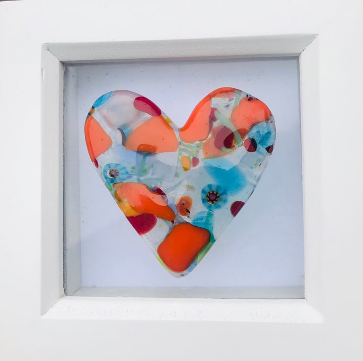 Fused glass boxed framed cast heart made by me in my kiln in devon . Frame size approx 10cm square . . No two hearts are ever the same due to the way I make them . Lovely sentiment without taking up much room in your home .