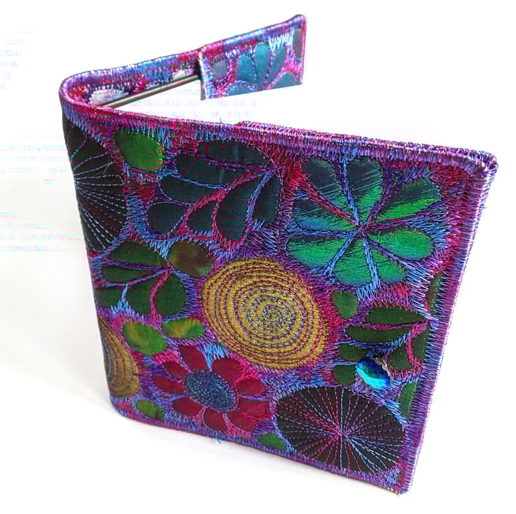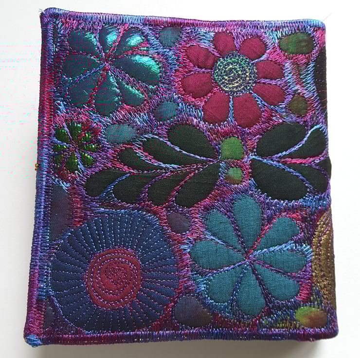 This is a handmade machine stitched fabric textile notebook cover and cream plain paper artists sketchbook 12cms x 12cms. 80 sheets 140gsm acid free. The cover is removeable and you can replace the sketchbook inside.