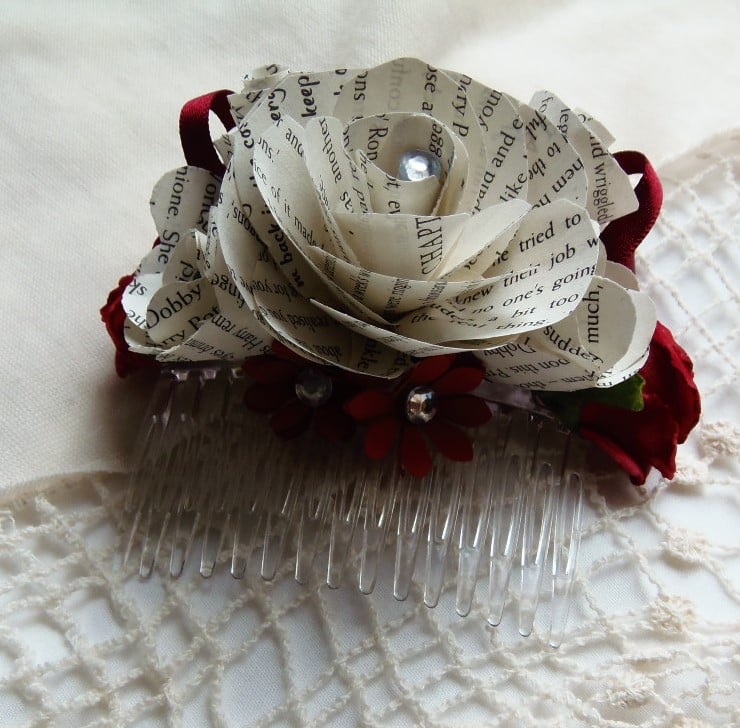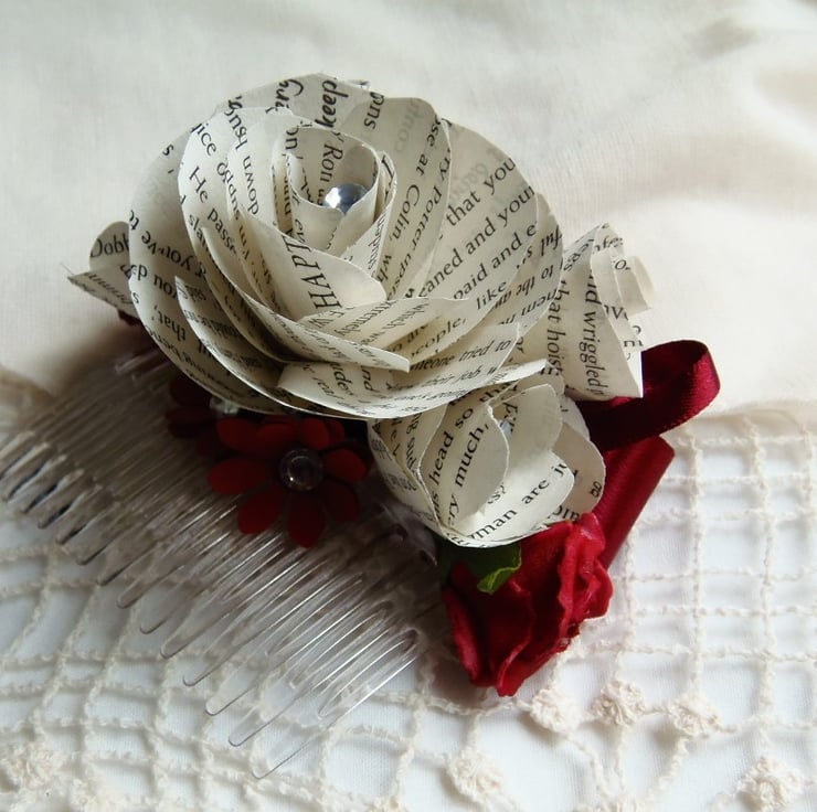 Set on a clear plastic hair comb, a single book page rose with 2-4 mini book page buds, 2 red mini foam roses and 2-3 mini paper roses all roses will have a faux diamante gem at their centre.