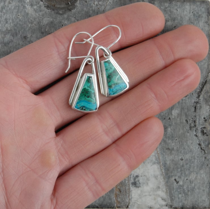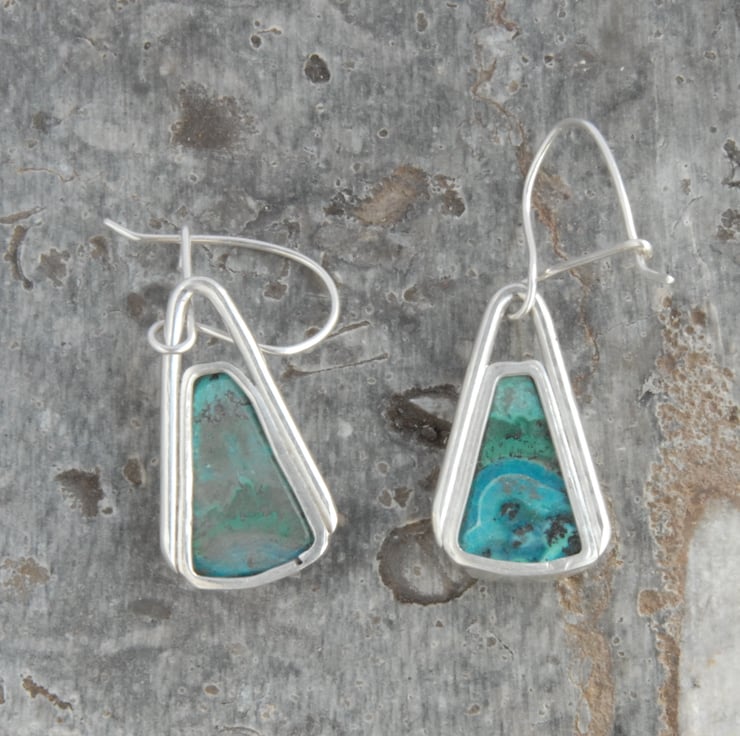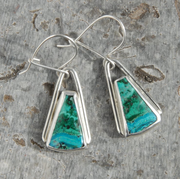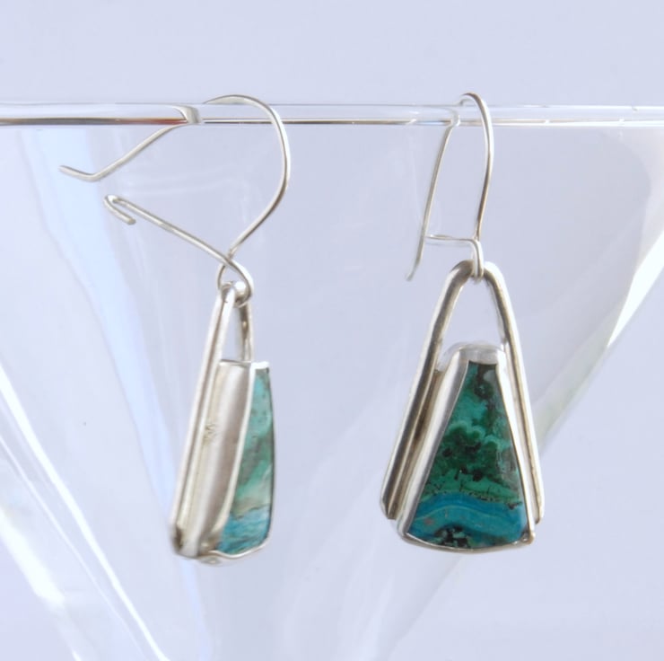 These colourful earrings feature trapezoid drops of malachite co formed with chrysocolla meaning it has bands of bright turquoise blue amongst the swirls of green. The earrings are made with sterling silver and a border of silver wire surrounds the malachite to create a triangle with the safety hook attached in the top void. Safety hooks (also known as kidney wires) have a little loop at the back which the main hook slots into thus keeping the earring secure in your ear. This is a softer stone I suggest keeping them in the black box they come in to prevent it from getting scratched by other jewellery in your collection.