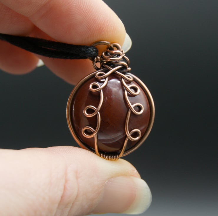 This striking little pendant features a circular flat-backed stone, which I have wrapped with copper wire. One wire frames the stone & forms a looped bail. I've then woven a second wire onto the bottom of the frame, bending the ends up across the stone & creating three loops in each wire. I've finished the pendant with random loops around the bail.