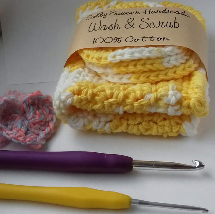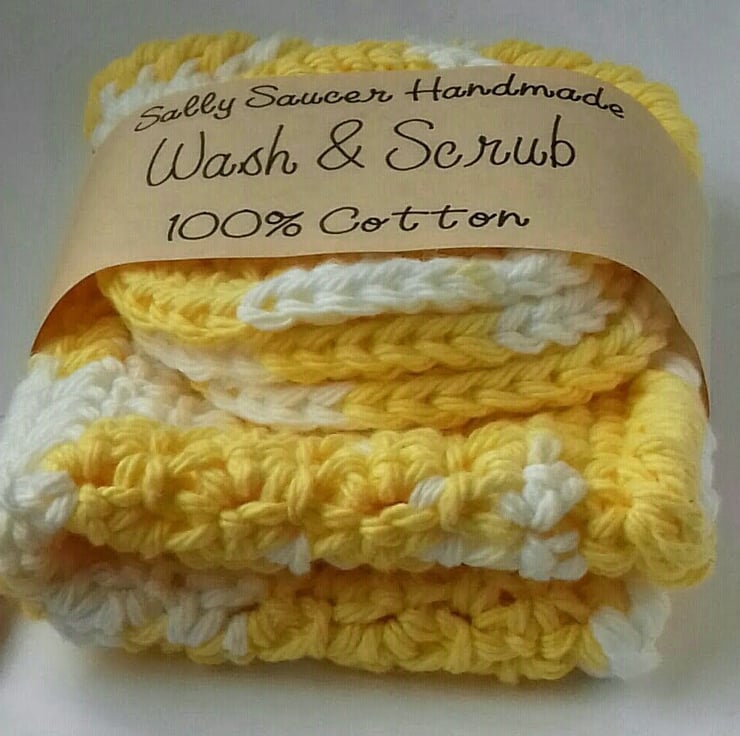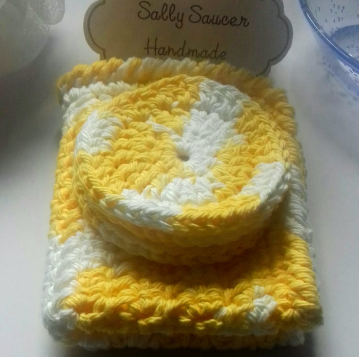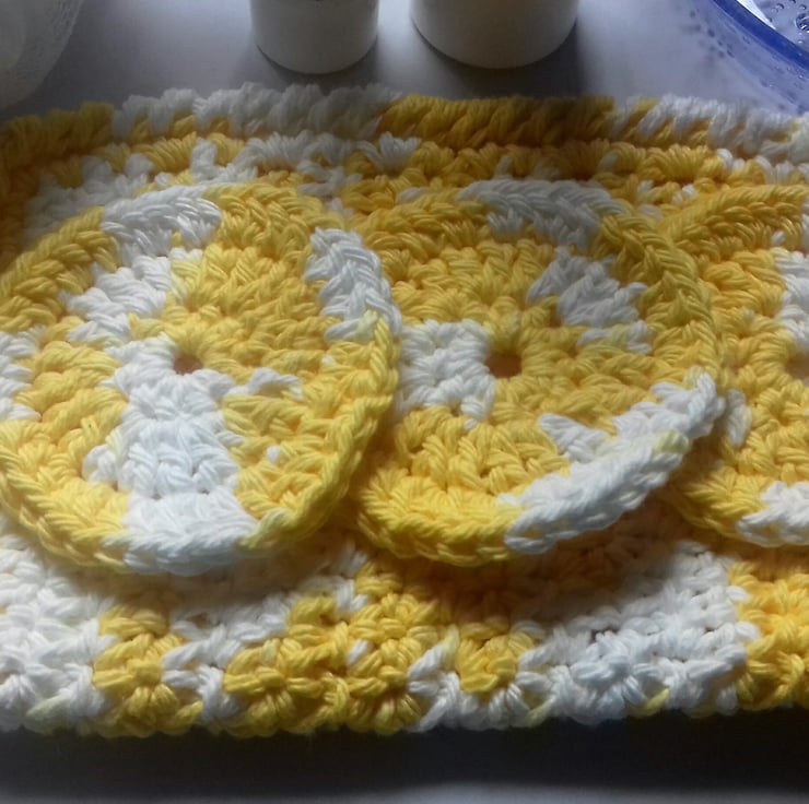 Spring has sprung! Gorgeous yellow and white crocheted wash cloth and 3 Face Scrubbies.