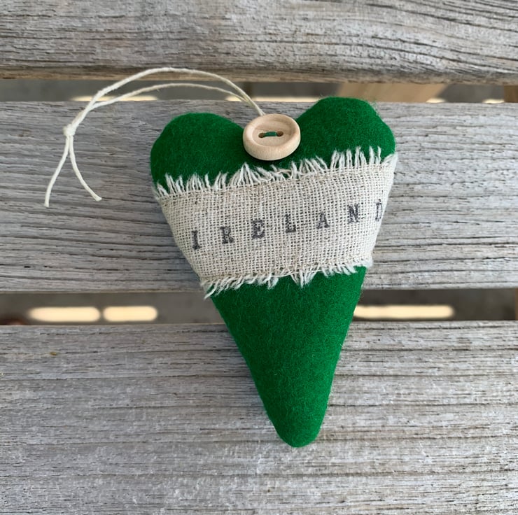 Filled with fragrant lavender, the hearts are available in a rich shamrock green and are made of superior merino-wool felt, finished with a homespun 'Ireland' printed ribbon and a rustic wooden button, plus a hemp twine hanging loop.