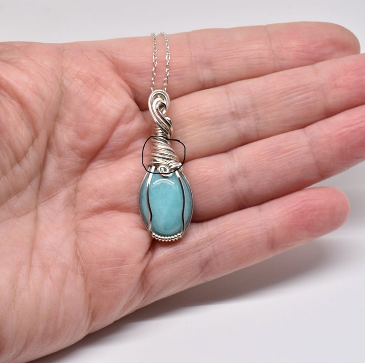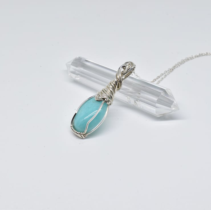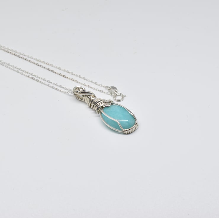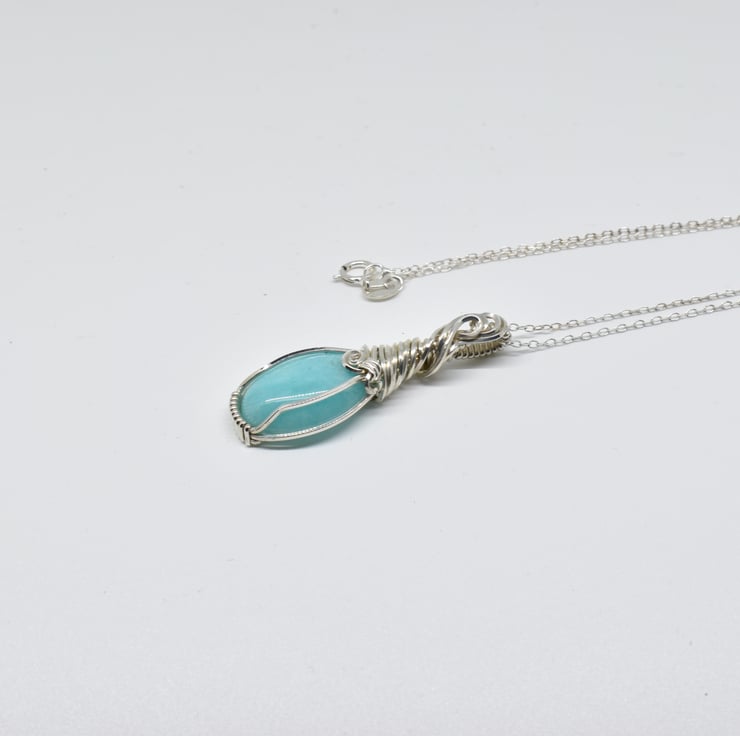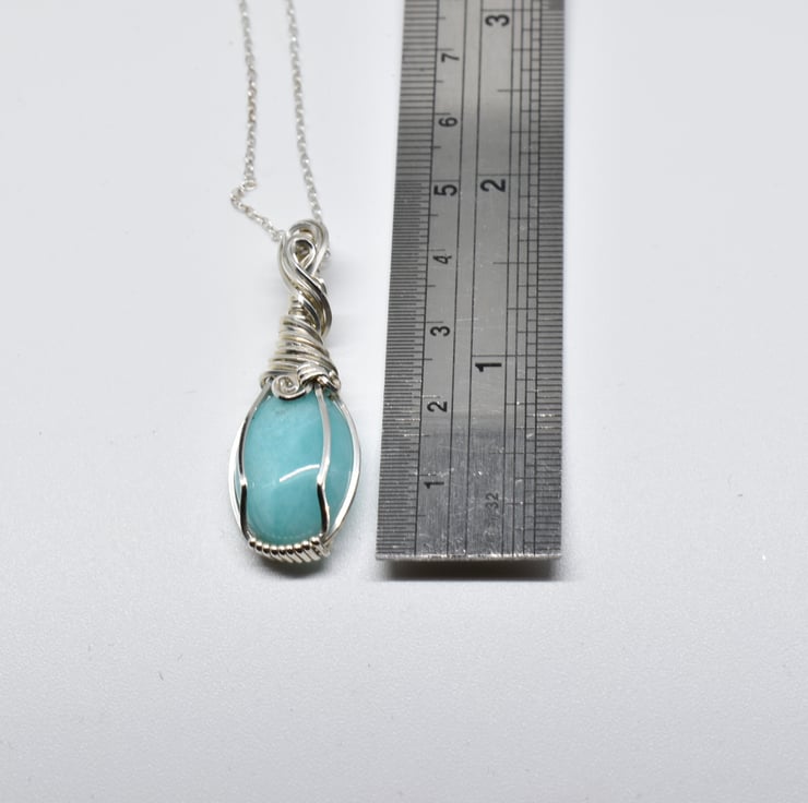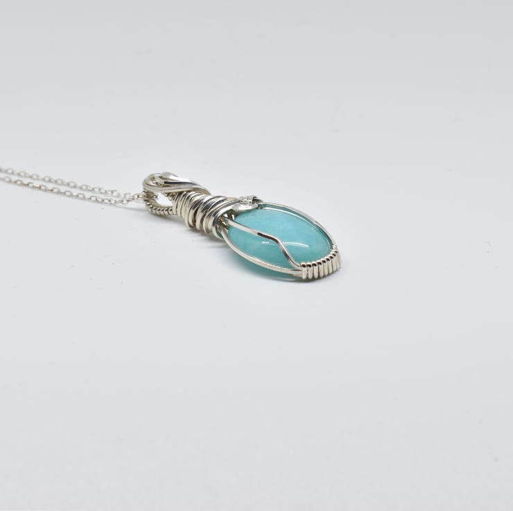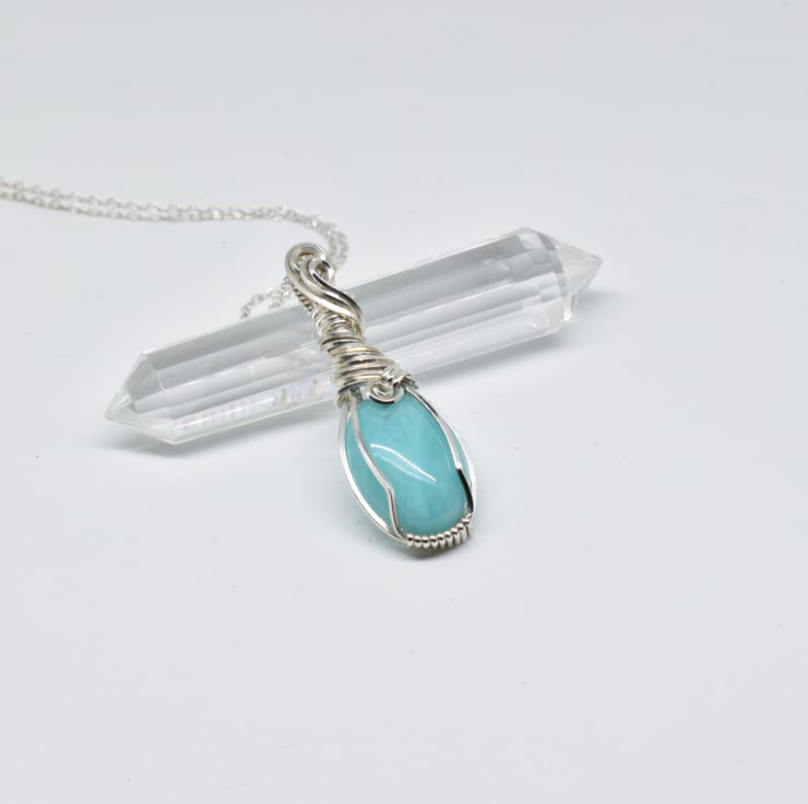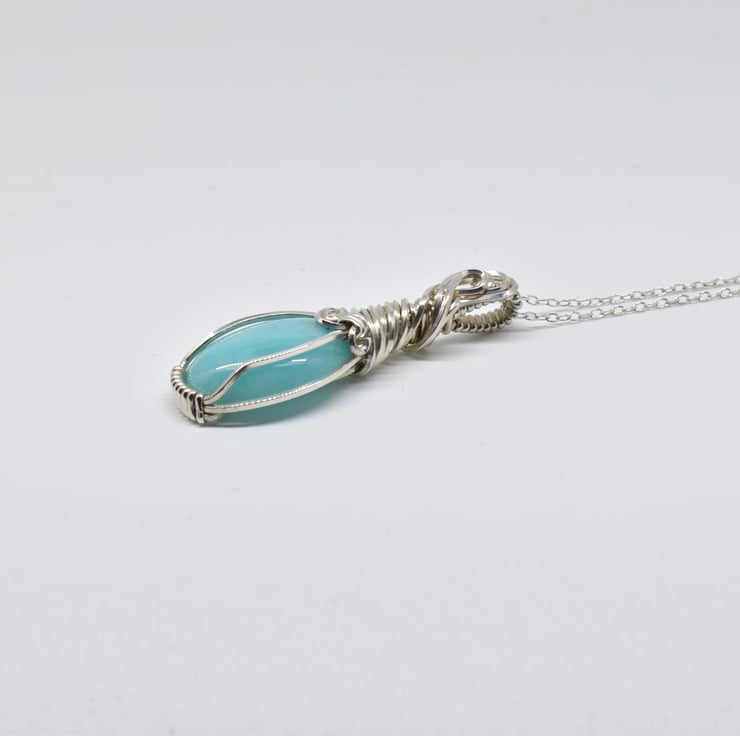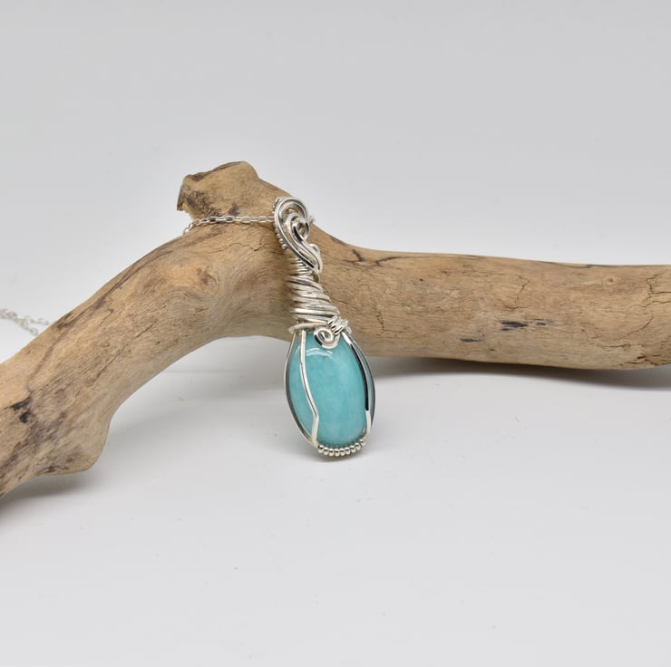 I have used sterling silver wire to wire wrap around this beautiful amazonite stone to make this perfectly imperfect pendant which hangs from an 18" sterling silver chain.