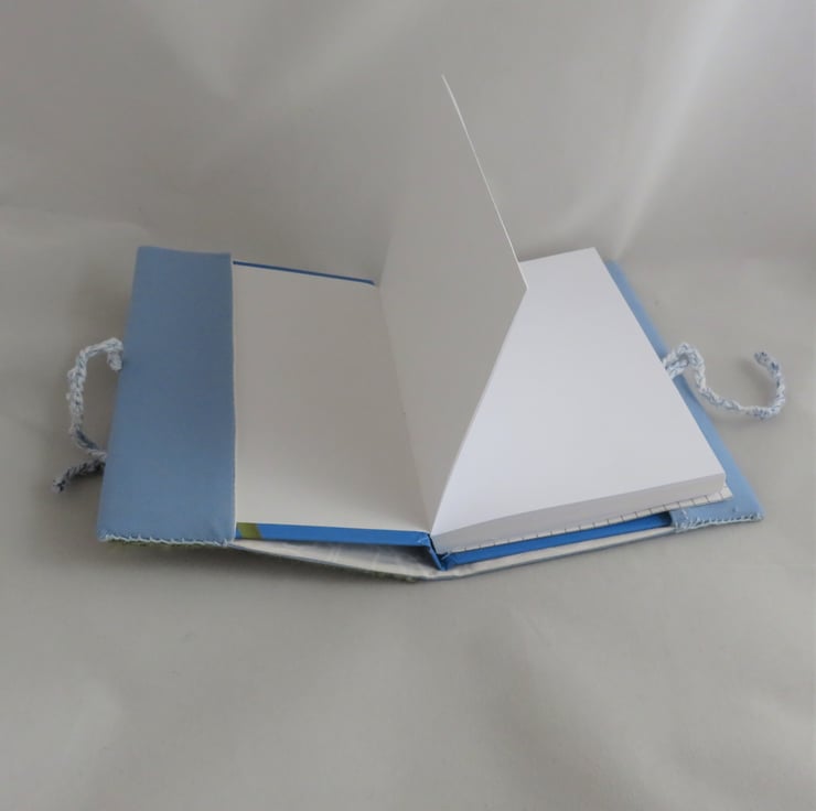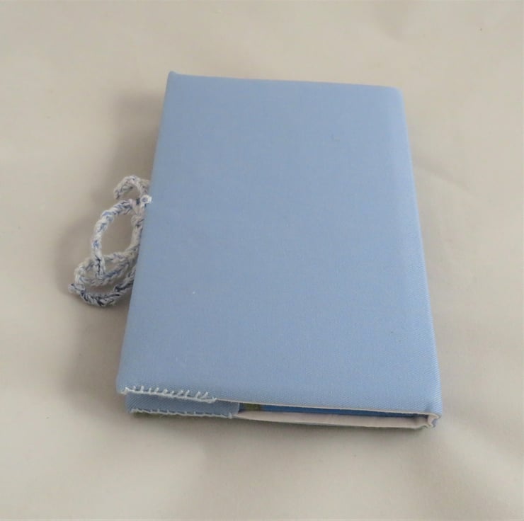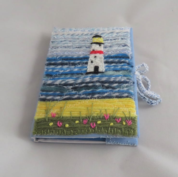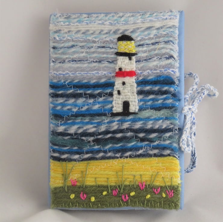 The background for this design has been created by 'felting' lengths of yarn to a felt background, using an embellisher machine. In order to stabilise the attachment of the yarn, random machine stitching in zigzag stitch in fine white thread has been worked across the design. Using wool and cottons, a lighthouse has been embroidered. Thrift and yellow coastal poppies have been represented by simple stitching in the foreground of the design. The embroidered panel has been stitched to a cover created from pale blue fabric lined in a white and cream print fabric. The cover is slipped onto a standard A6 notebook (of plain,un-ruled leaves) which is included. Crocheted cords, tied in a bow, provide a closure for the cover. Replacement notebooks are commonly available.