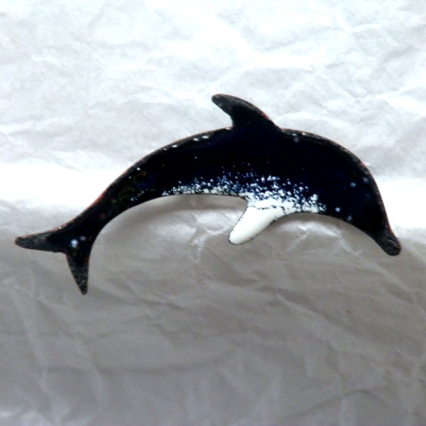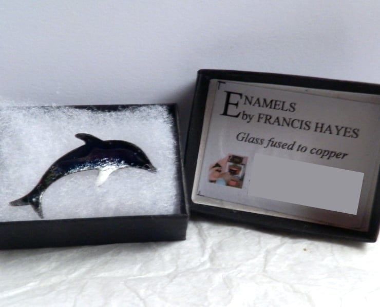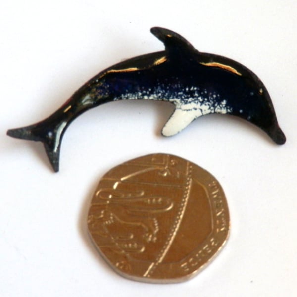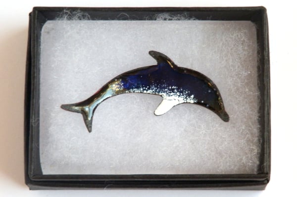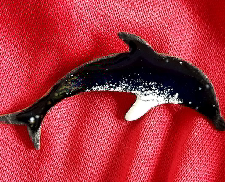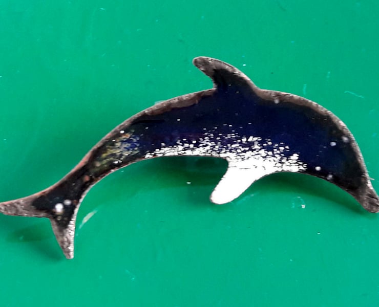 The dolphin measures 43mm from nose to tail, 18mm across the widest section, across the two fins. I have soldered a 19mm brooch bar to it.