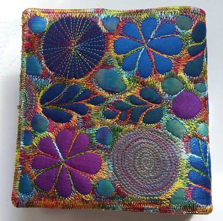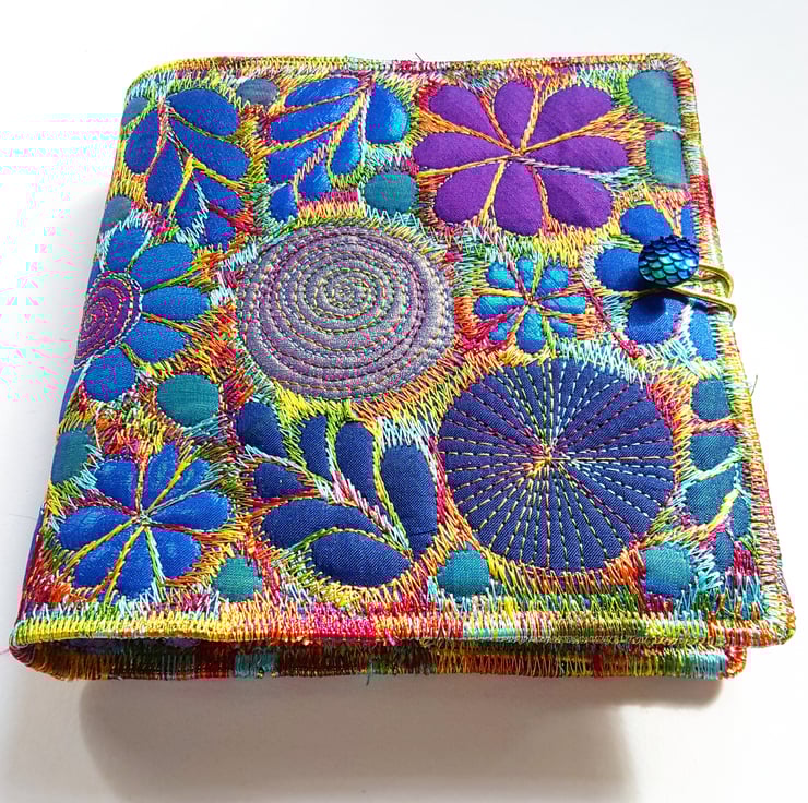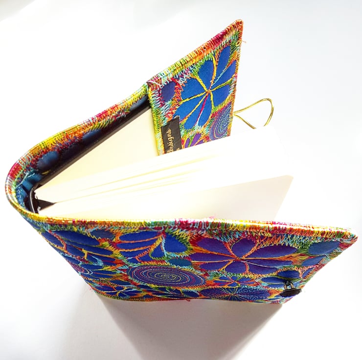 This is a handmade machine stitched fabric textile notebook cover and cream plain paper artists sketchbook 12cms x 12cms. 80 sheets 140gsm acid free. The cover is removeable and you can replace the sketchbook inside.