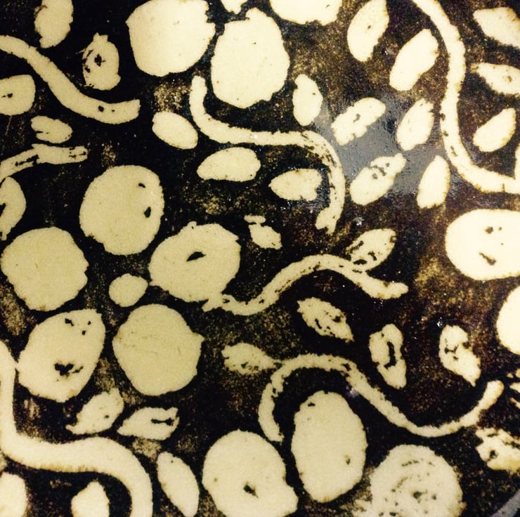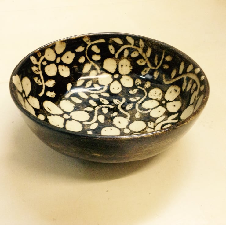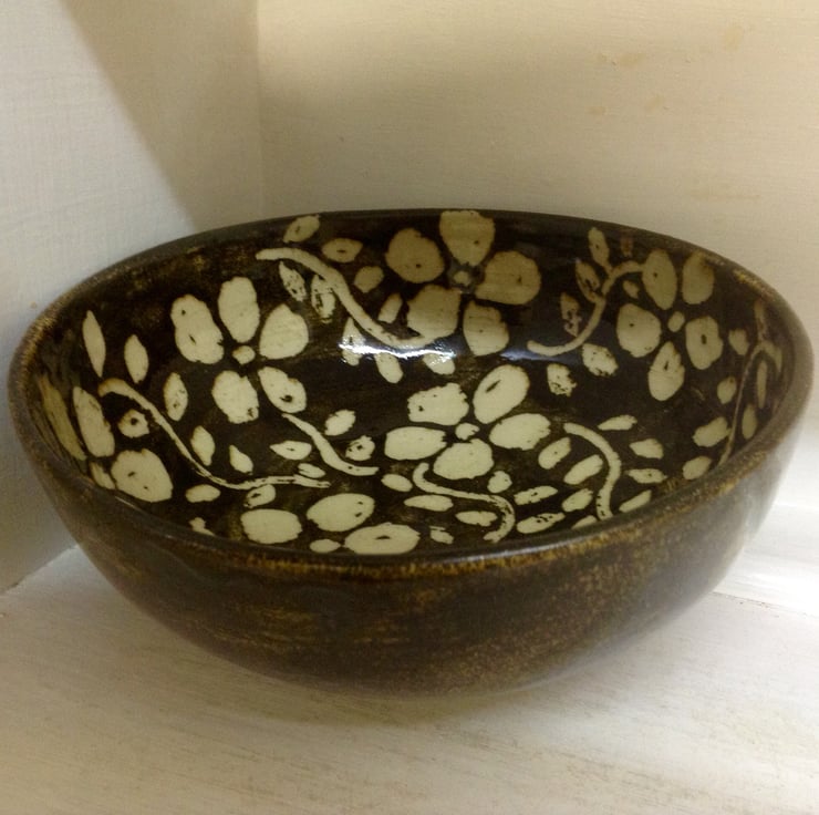 Very pretty hand thrown and hand decorated stoneware bowl with a beautiful soft focus all over floral decoration in cream and dark brown iron oxide. It has a glossy transparent pale honey coloured glaze. The bowl is made from tough high fired stoneware clay and is microwave and dishwasher safe. It measures 22 cms across and is 8cms deep. It makes a perfect fruit bowl.