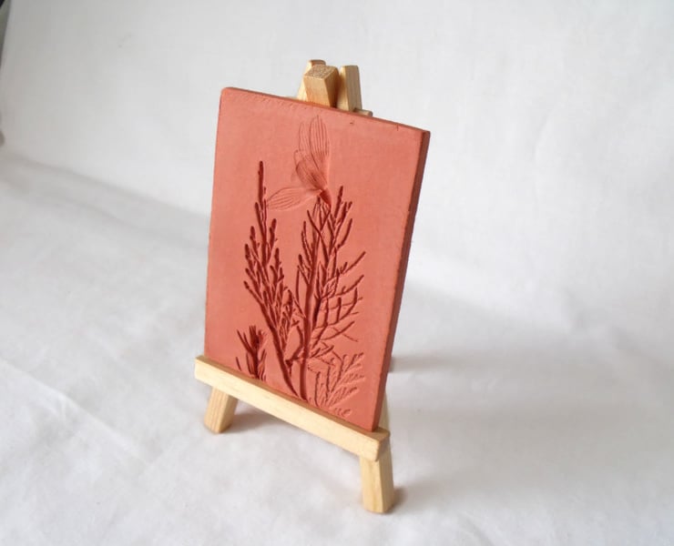 Lovely terracotta tile, impressed with foliage from my local park, I thoroughly enjoyed collecting the pieces, it was a mindful experience. I hope you like them too.